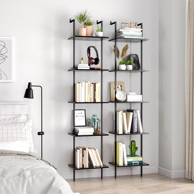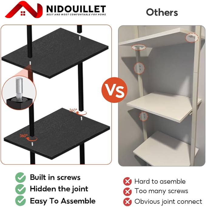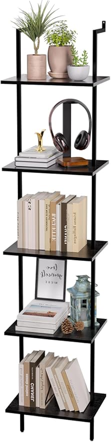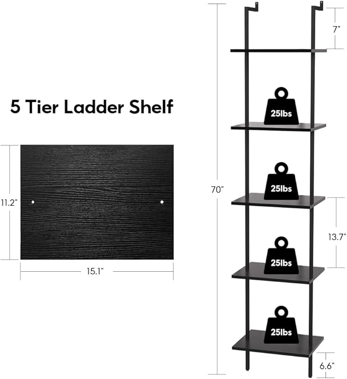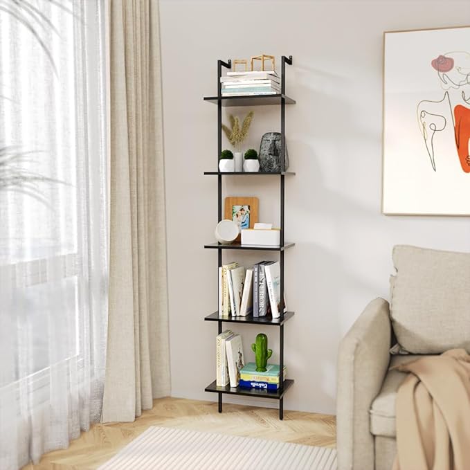 Nidouillet 5 Tier Ladder Shelf, 70-Inch Wall Mounted Ladder Bookshelf Metal Frame Storage Rack and Industrial Display Shelves for Living Room Bedroom Home Office - Black