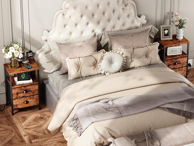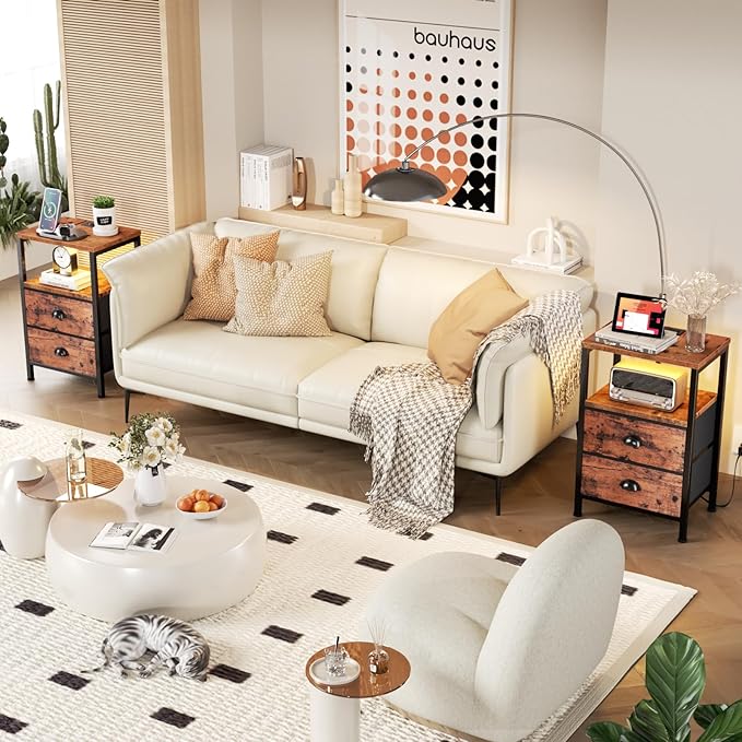 Furologee Nightstand with Charging Station, End Table with LED Lights, Bedside Table with USB Ports & Outlets, Night Stands with 2 Drawers, Side Table for Living Room/Bedroom