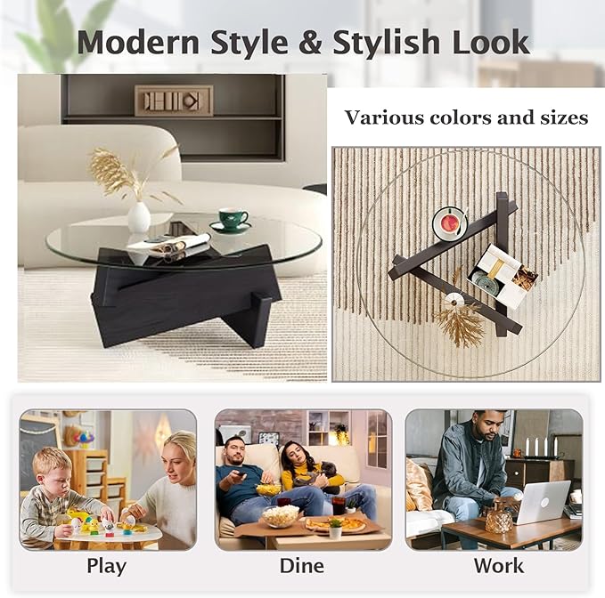 Coffee Table, Round Coffee Table for Living Room Modern Glass Coffee Table with Solid Wood Legs Farmhouse Mid Century Center Table Large Circle Cocktail Table (Black + Gray, 31.5in)