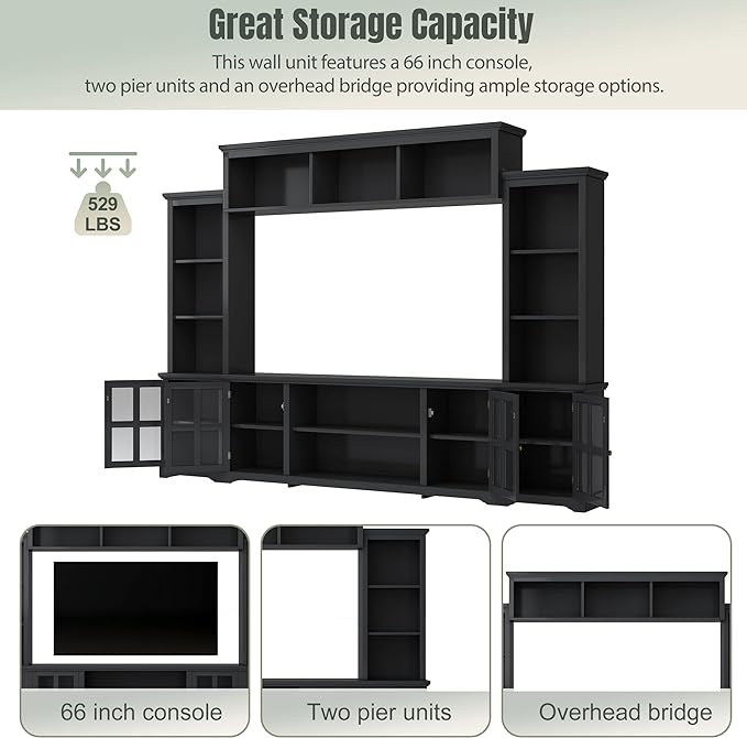 Merax Multifunctional TV Stand with Tempered Glass Door, Minimalism Style Entertainment Wall Unit with Bridge Modern Console Table for Televisions Up to 70”, 104.3 inch Length, Black