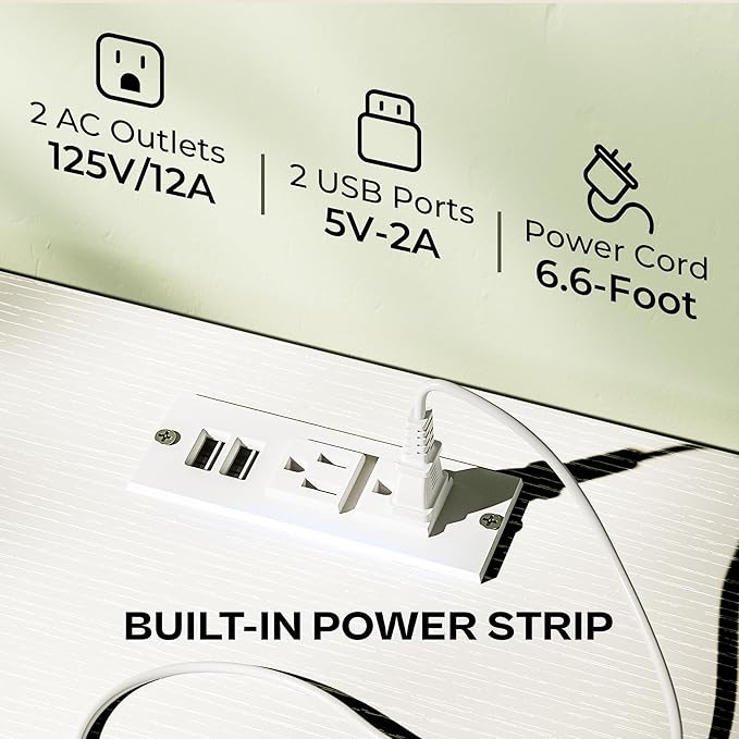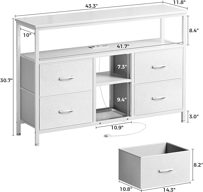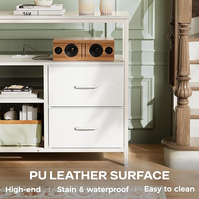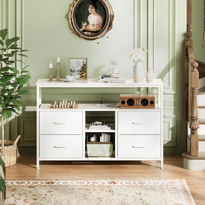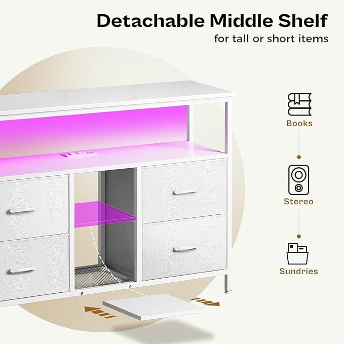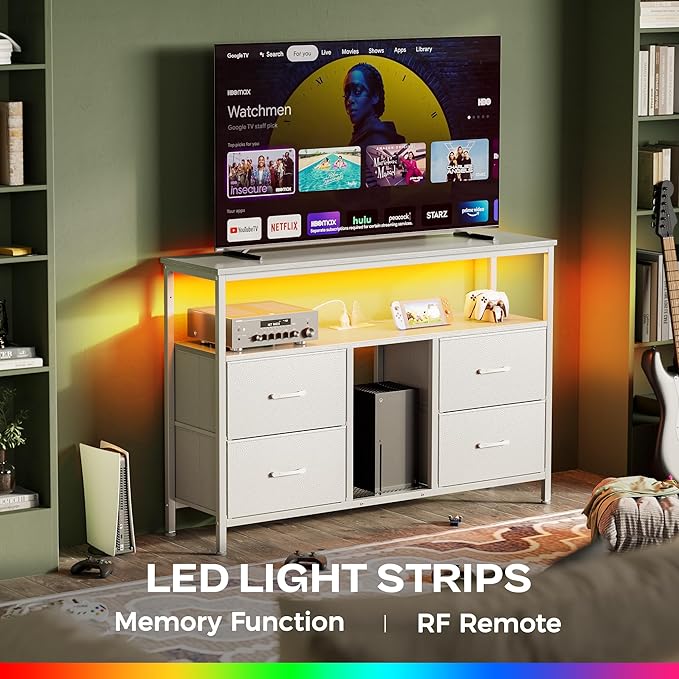 TV Stand Dresser with Power Outlets and LED Lights, 4 Drawers Entertainment Center with Open Shelf, Media Console for 50 43 Inch TV, Dresser with PU Finish, White
