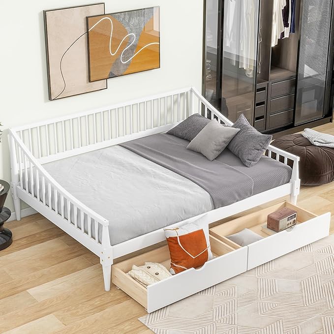 Full Size Daybed with Two Drawers,Solid Wood Storage Bed Frame W/Wooden Slat Support,Guide Rail Design on Three Sides,Easy to Assemble,for Bedroom Living Room,White