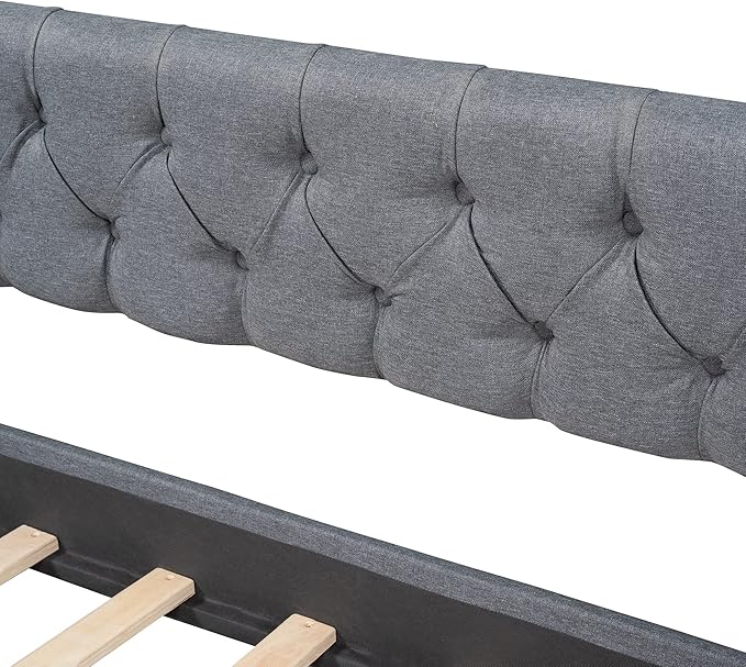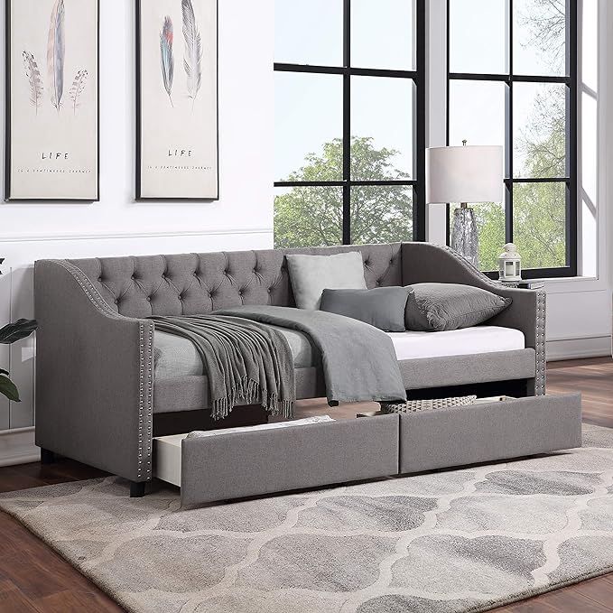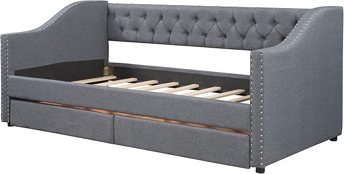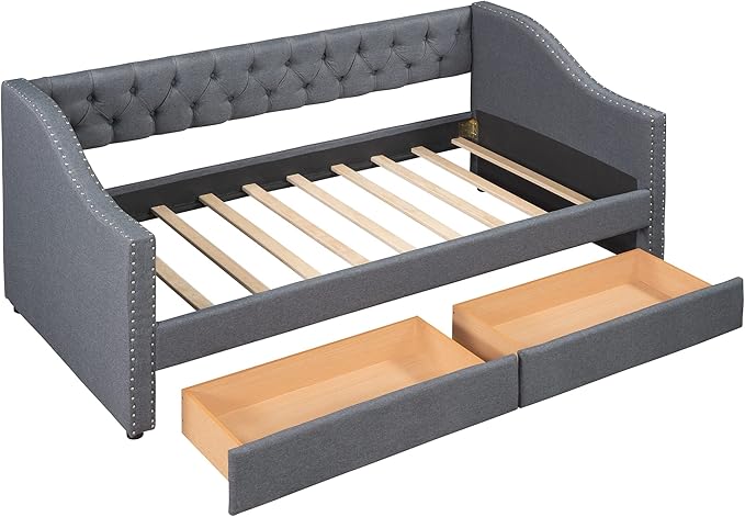 Twin Size Upholstered Linen Fabric Daybed with Two Drawers,Wooden Storage Bed Frame,W/Diamond-Tufted Backrest & 2 Armrests,Wood Slat Support,for Living Room Bedroom,Gray