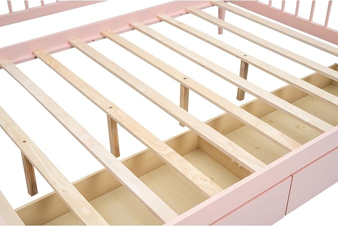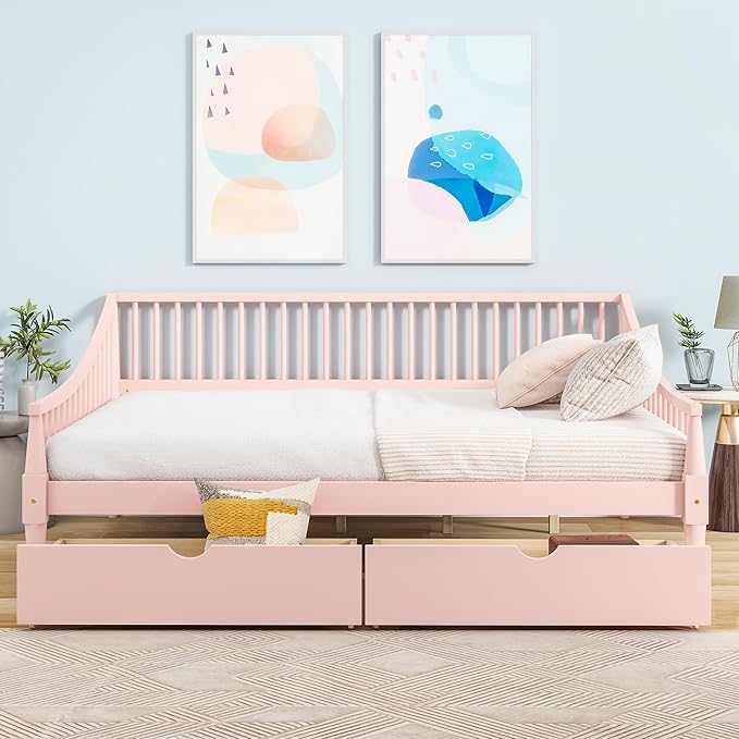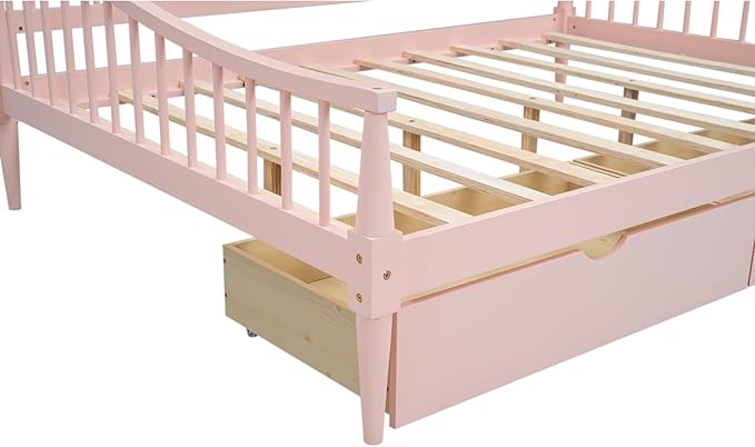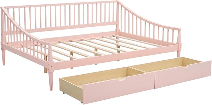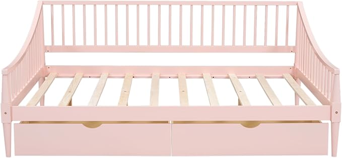 Full Size Daybed with Two Drawers,Solid Wood Storage Bed Frame W/Wooden Slat Support,Guide Rail Design on Three Sides,Easy to Assemble,for Bedroom Living Room,Pink