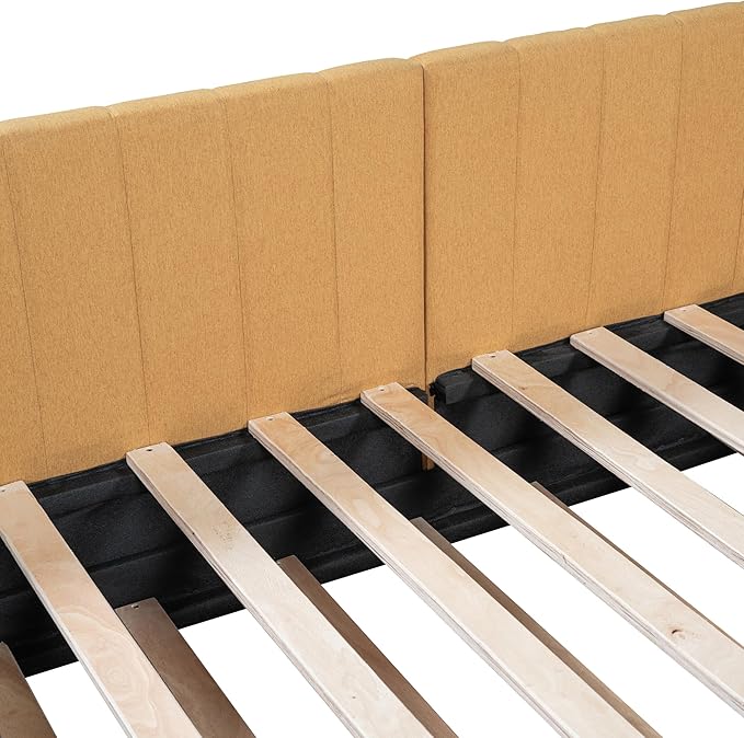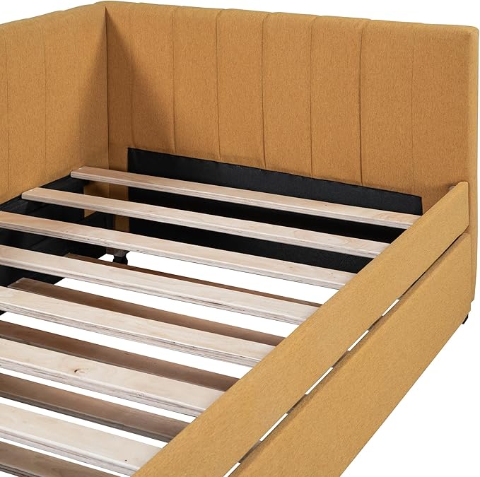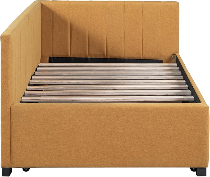 Twin Size Upholstered Linen Daybed with 2 Trundle,Semi-Closed Design,Solid Wood Bed Frame,W/Backrest and Slat Support,No Box Spring Needed,for Apartment Bedroom,Yellow