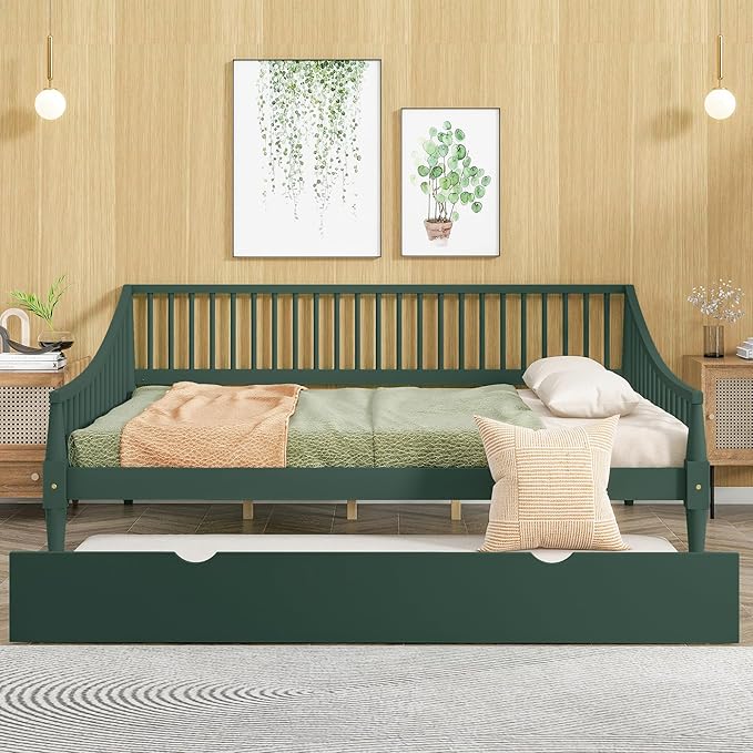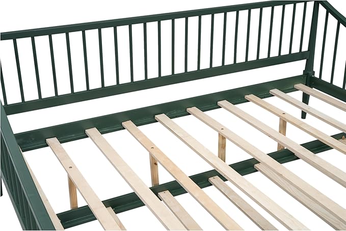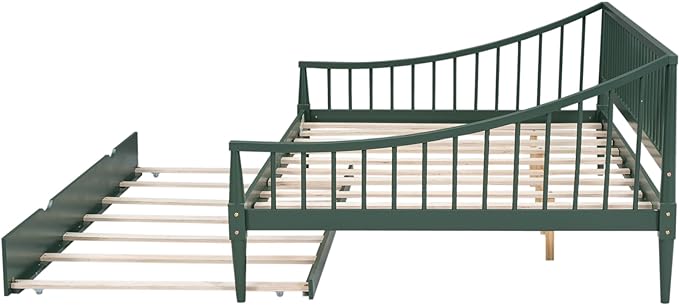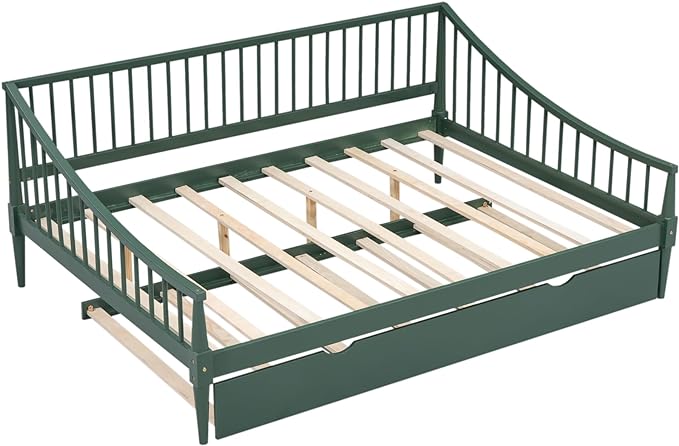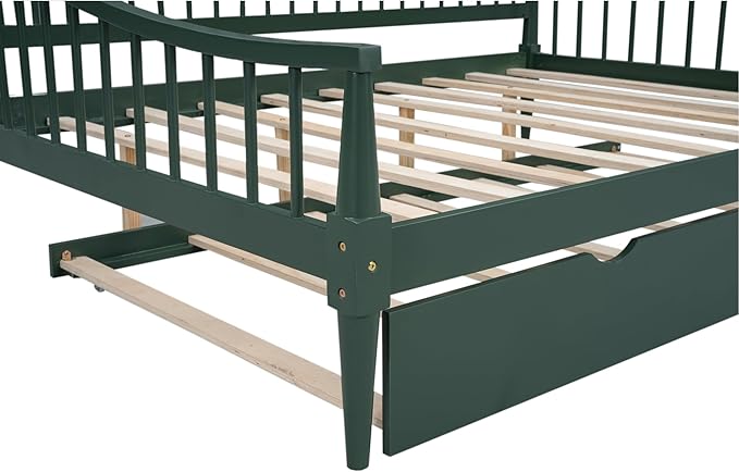 Full Size Daybed with Hideaway Trundle and Support Legs,Multi-functional Wood Bed Frame,W/Rails Three Sides,Easy to Assemble,for Bedroom,Living Room,Apartment,Green