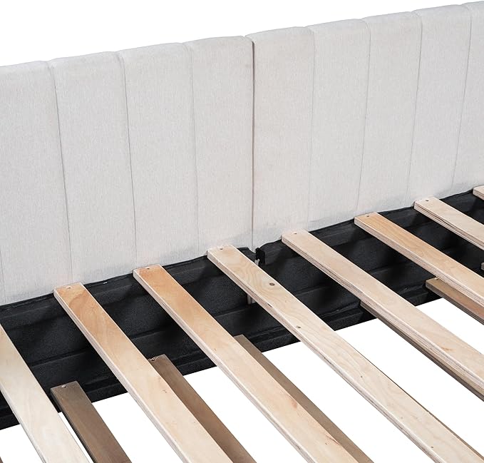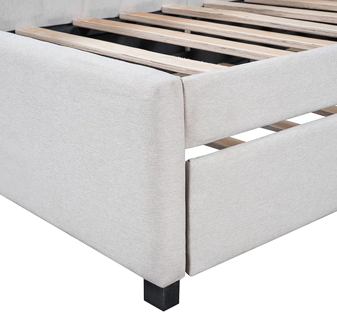 Twin Size Upholstered Linen Daybed with 2 Trundle,Semi-Closed Design,Solid Wood Bed Frame,W/Backrest and Slat Support,No Box Spring Needed,for Apartment Bedroom,Beige
