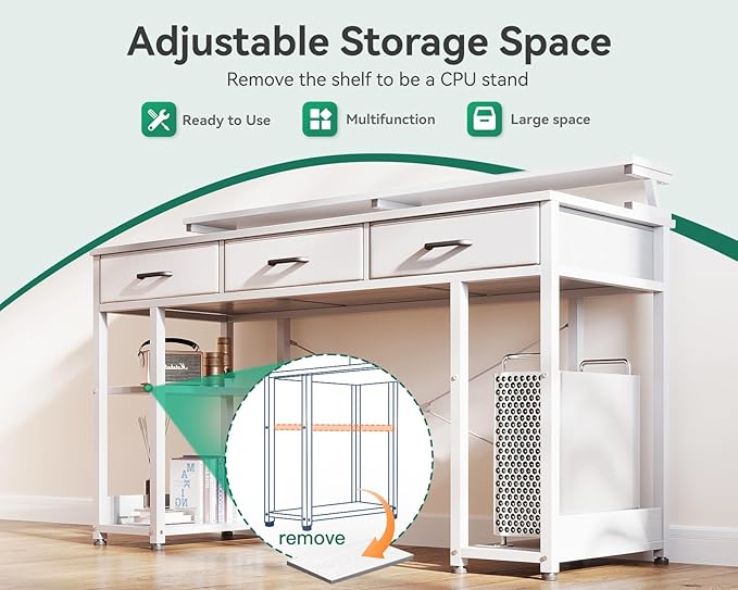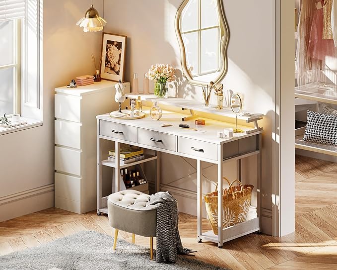 AODK 48 inch Computer Desk with 3 Drawers, Gaming Desk with LED Lights & Power Outlets, Home Office Desk with Storage Shelves & Monitor Stand, Modern Work Study Writing Table for Small Spaces, White
