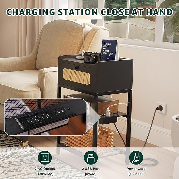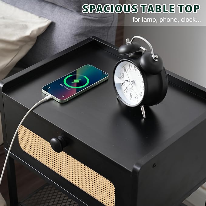 Night Stand set 2, Side Table with Rattan Drawer, Nightstand with Charging Station, Industrial Bedside Table with 3-Tier Storage, Black JET003CB2