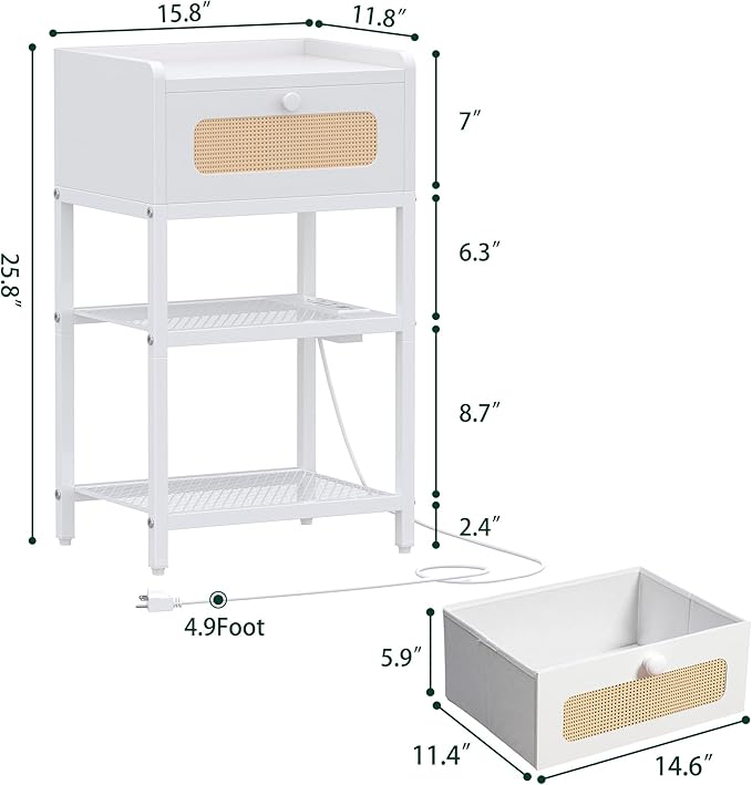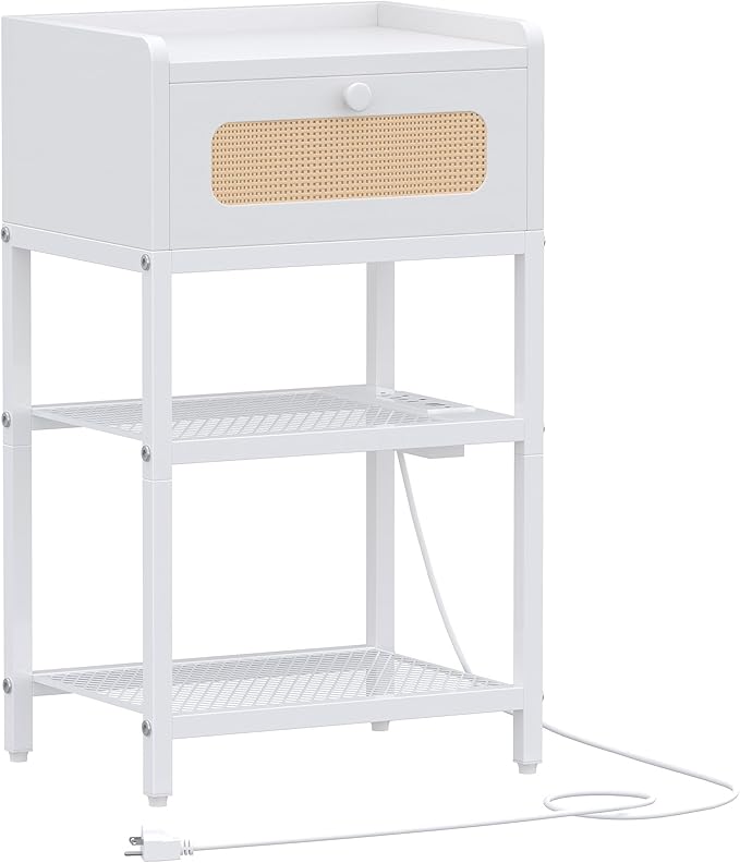 Night Stand, Side Table with Rattan Drawer, Nightstand with Charging Station, Industrial Bedside Table with 3-Tier Storage, White JET003CW1