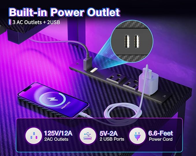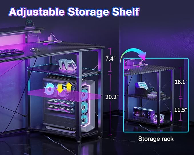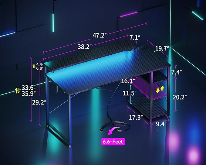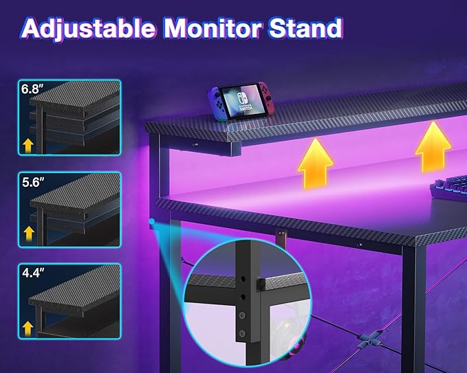 MOTPK Gaming Desk with Led Lights & Power Outlet, 47 Inch Gaming Computer Desk with Shelves, Reversible Gamer Desk Table with Adjustable Monitor Stand & Headphone Hook, Carbon Fiber Texture, Black
