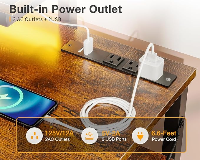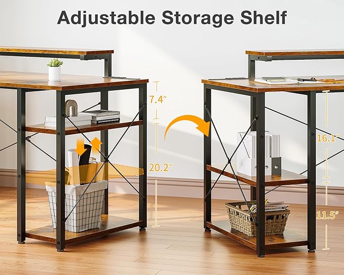MOTPK Small Computer Desk with Led Lights & Power Outlet, 40 Inch Reversible Writing Desk with Shelves, Kids Desk with Adjustable Monitor Stand & Headphone Hook, Work Desk for Home Office, Brown