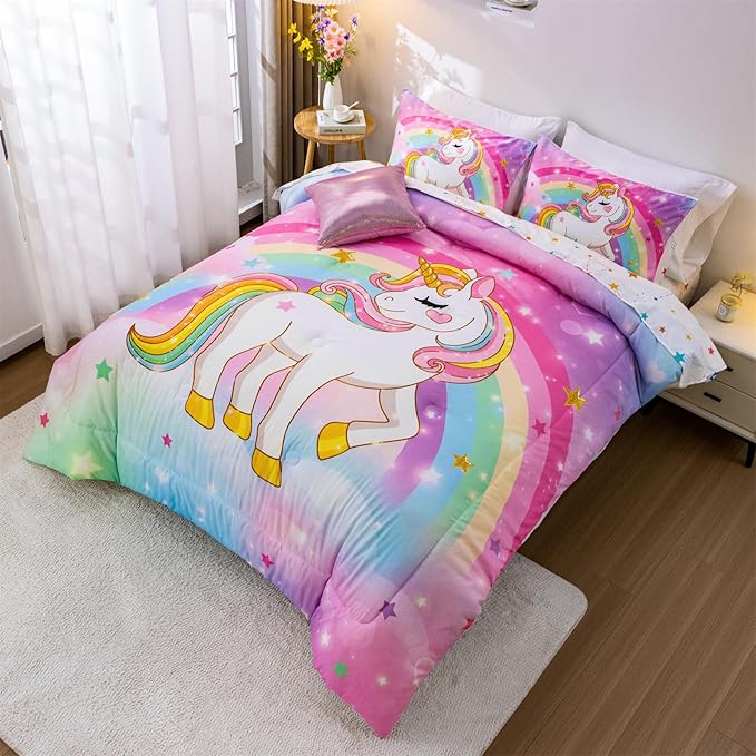 Aimuan Girls Unicorn Comforter Set 6 Pieces Pink Purple Bedding Set with Rainbow Star Galaxy Stars Fantasy Children Room Decor Soft Reversible Bed Sets for Boys/Girls/Teens (Rainbow Twin6Pcs)