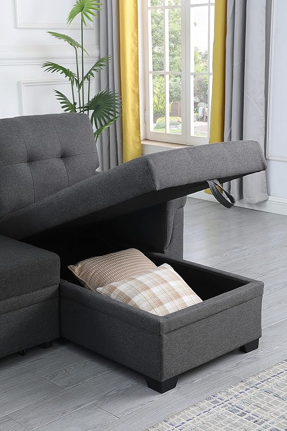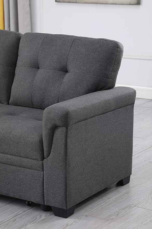 LOVMOR L-Shape Reversible Linen Fabric Sleeper Sectional Sofa with Storage Chaise, Dark Gray Corner Couch with Arms for Living Room, Home Furniture, Apartment, Dorm, 84 Inch
