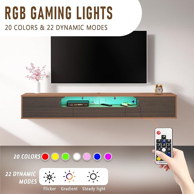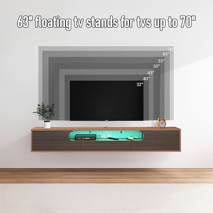 Pmnianhua Floating TV Stand with LED Lights,63'' Wall Mounted TV Cabinet Floating under TV Shelf Media Console Entertainment Center with Storage Living Room Playroom Bedroom(walnut)