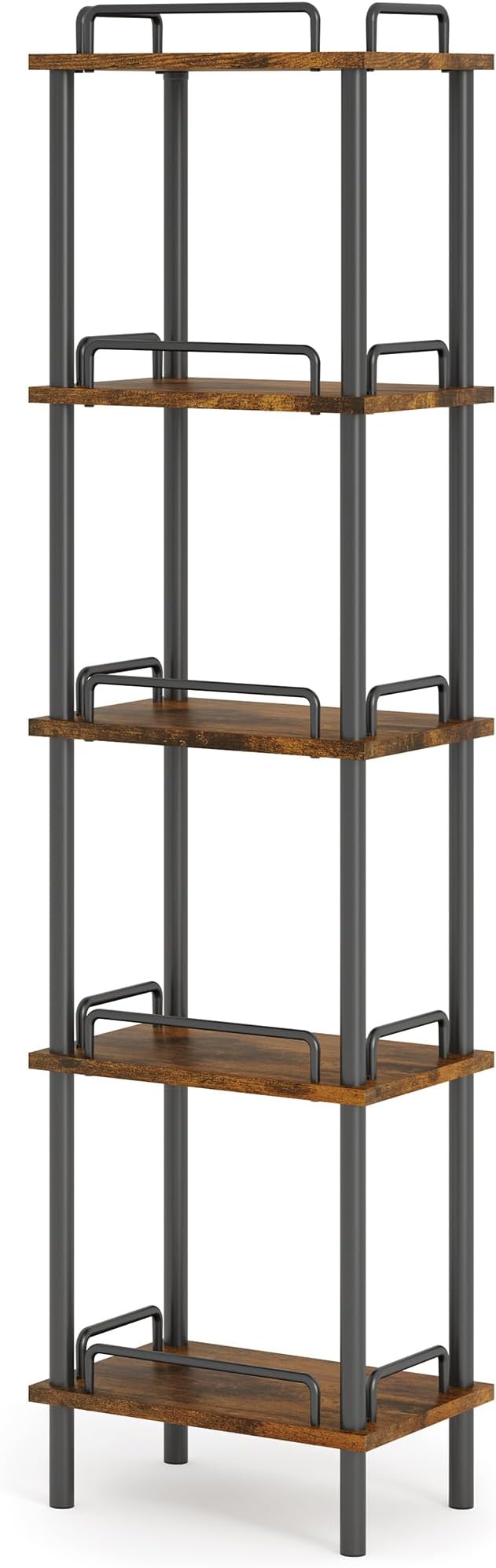 5-Tier Tall Bookshelf, Narrow Bookcase with guardrail, Freestanding Storage Stand Display Rack for Living Room, Bedroom, Home Office, Rustic Brown and Black