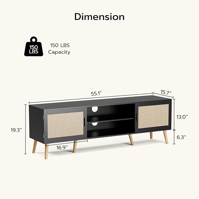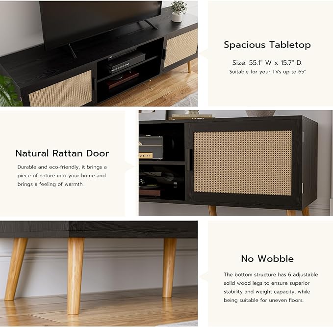 TV Stand for TVs up to 65'', Entertainment Center with Rattan Door, Shelves & 2 Cabinets, Boho Media TV Console for Living Room, Bedroom, Black