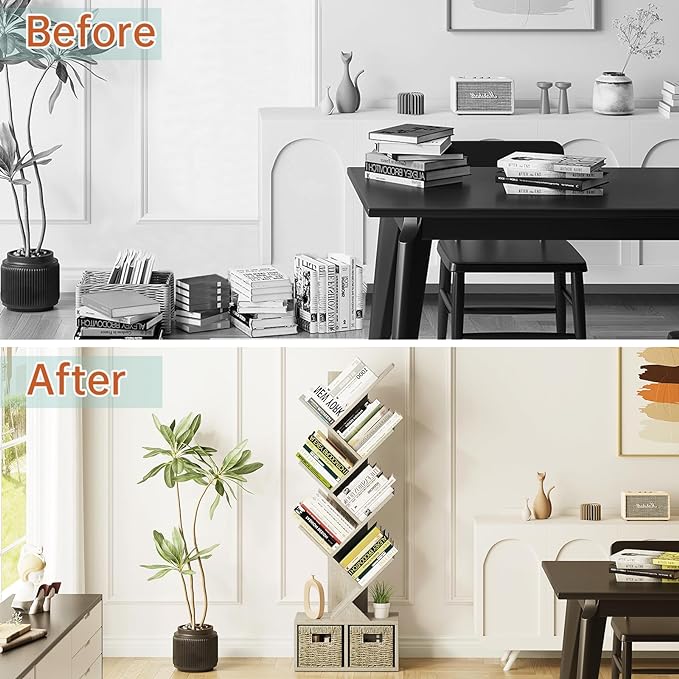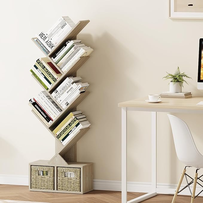 Vagusicc 6 Tier Tree Bookshelf - Retro Shelf Floor Standing Bookcase with Baskets, Tall Wood Book Storage Rack for Books/CDs, Tree Utility Book Organizer Shelves for Living Room, Home Office, Bedroom