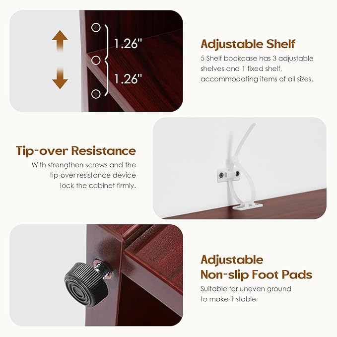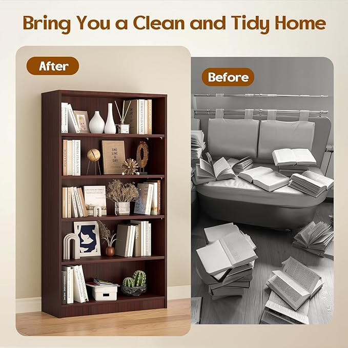 Soohow Mahogany Bookcase,Bookshelf for Bedroom,60 inches Tall Wood Book case Book Shelves,5 Shelf Book Shelves for Living Room Office