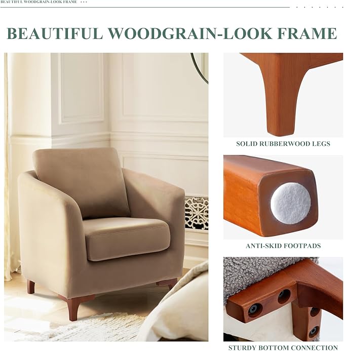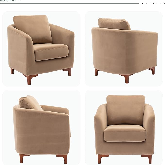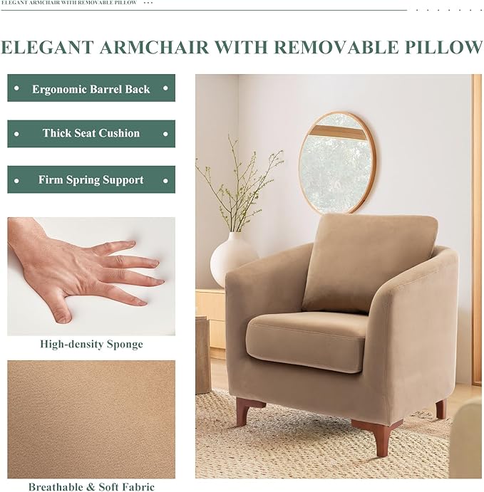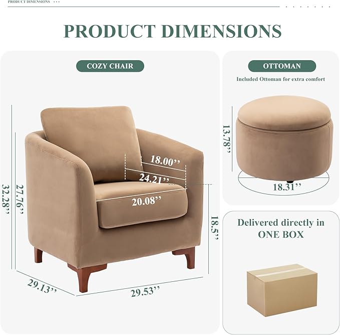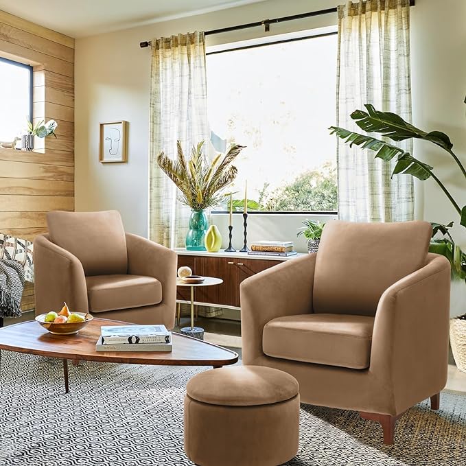 COLAMY Velvet Accent Chair with Storage Ottoman Set, Upholstered Barrel Arm Chair with Footrest, Modern Living Room Chair with Back Pillow, Camel