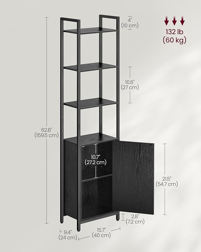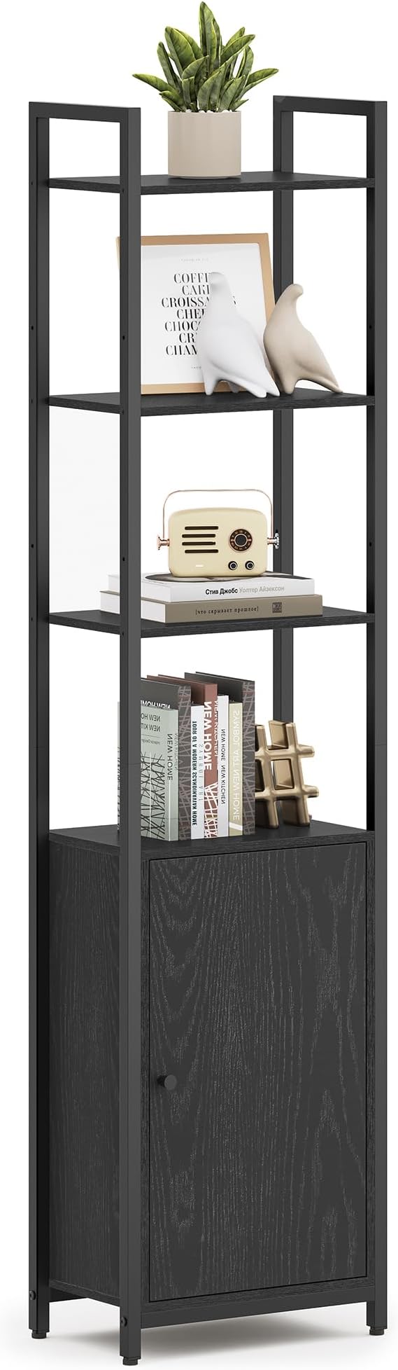 VASAGLE 6-Tier Bookshelf, Tall Bookcase with Door, Steel Frame, Adjustable Shelves, 9.4 x 15.7 x 62.8 Inches, Living Room Bedroom, Ebony Black and Ink Black ULLS132B01