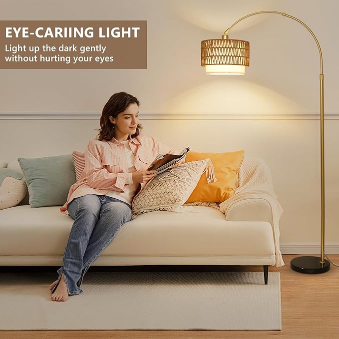 Arc Floor Lamp for bedroom with Rattan & Linen Shades, Gold Floor Lamp with Remote & Dimming Bulb, Rustic Standing Lamp with 3 Color Temperatures, Adjustable Height Farmhouse Tall Lamp for Living Room