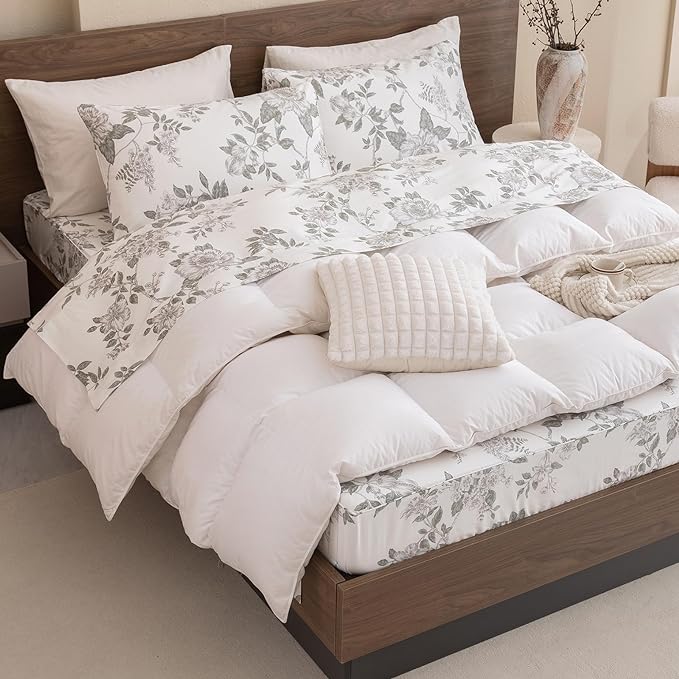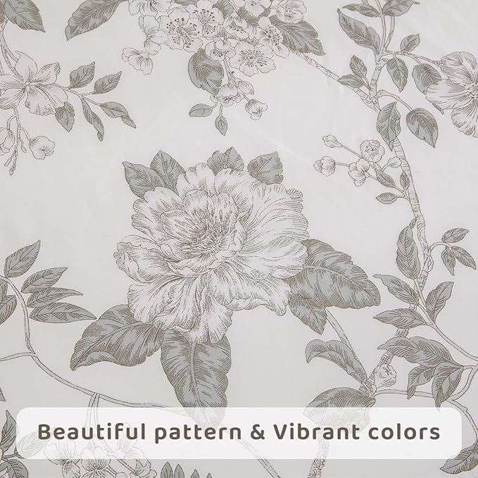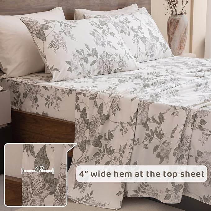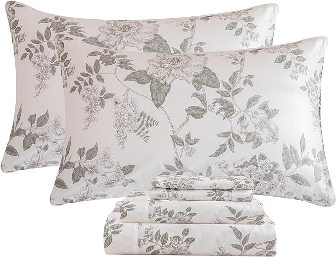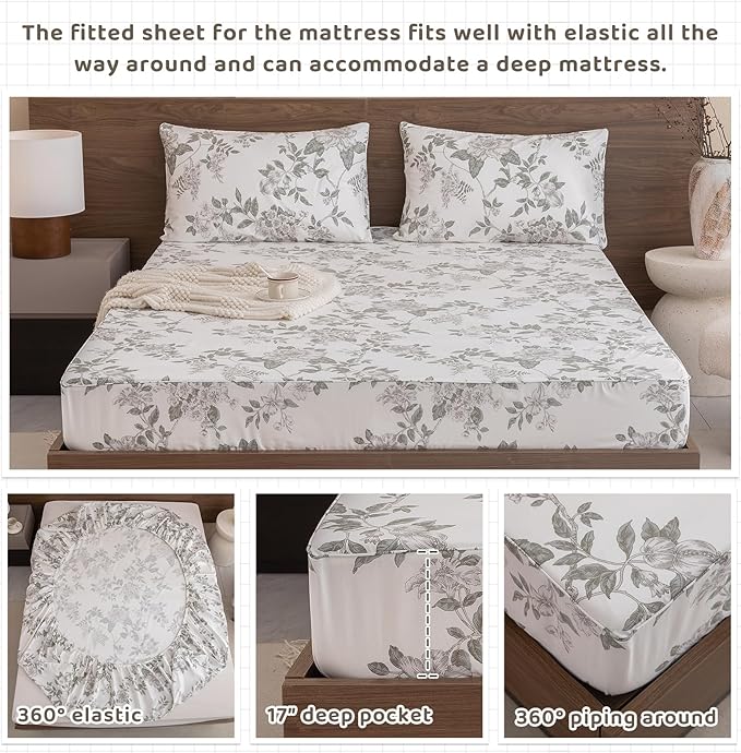 QSH Floral Egyptian Cotton Sheets Queen Size - Green Botanical Elegant Flower Pattern Printed Bedding Sheets Queen Size Bed Extra Soft and Breathable 4pcs Deep Pockets Bed Sheets