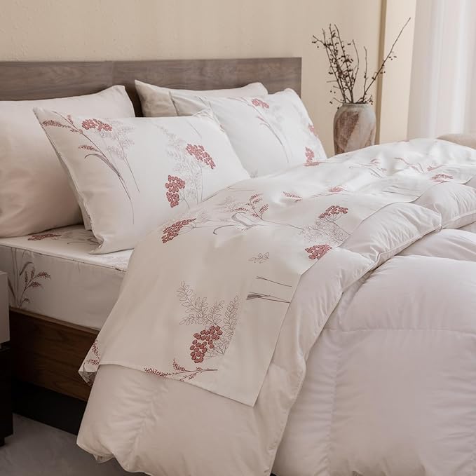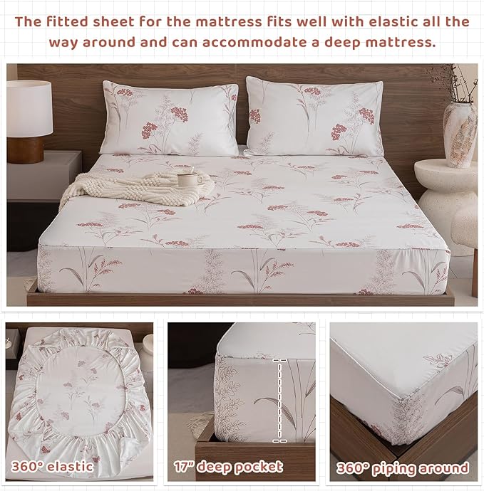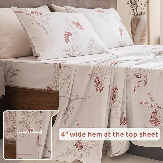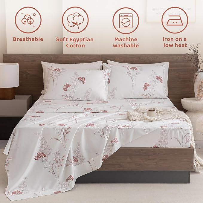 QSH Floral Bed Sheets Queen Size - 100% Egyptian Cotton Sheets Elegant Aesthetic Flower Pattern Printed Bedding Sheets Queen Size Bed Extra Soft and Breathable 4pcs Deep Pockets Bed Sheets