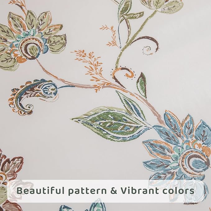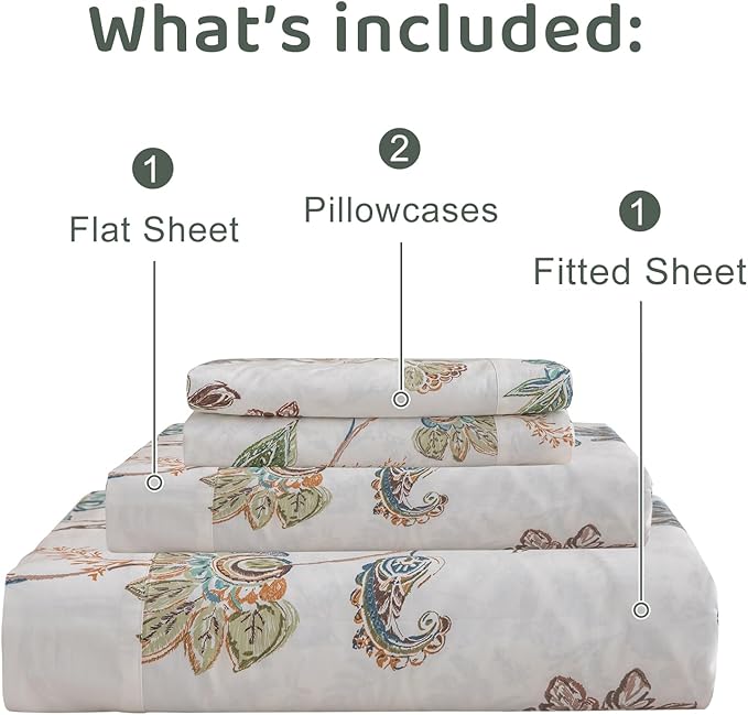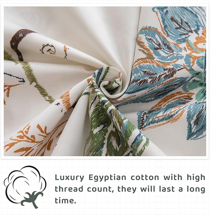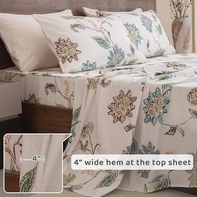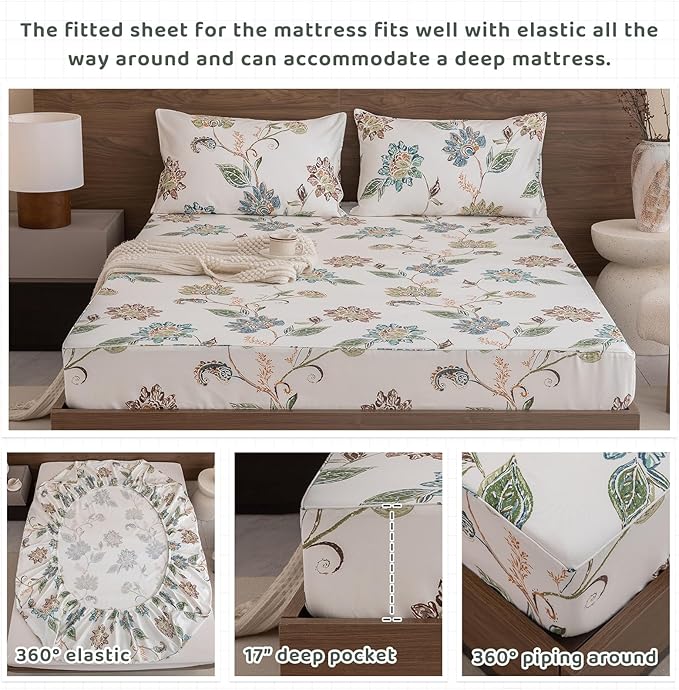 QSH Floral Bed Sheets Queen Size - 100% Egyptian Cotton Sheets Elegant Botanical Leaves Flower Pattern Printed Bedding Sheets Queen Size Bed Extra Soft and Breathable 4pcs Deep Pockets Bed Sheets