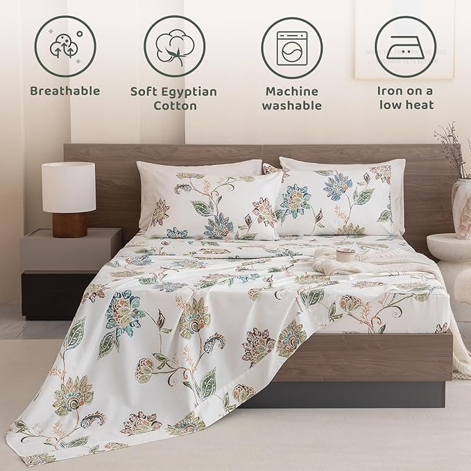 QSH Floral Bed Sheets King Size - 100% Egyptian Cotton Floral Bedding Sheets Botanical Leaves Flower Pattern Printed Bedding King Size Bed Sheets 17.5" Extra Deep Pocket 4pcs