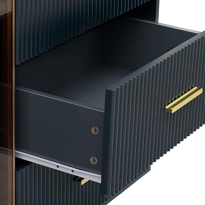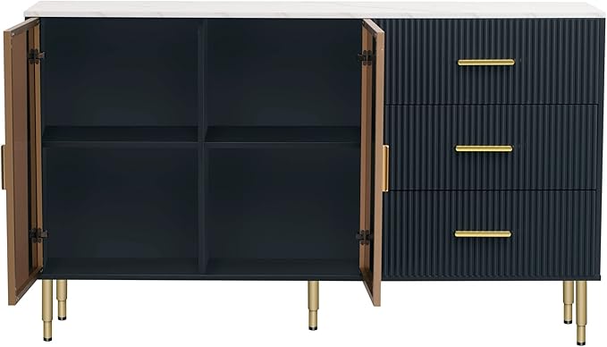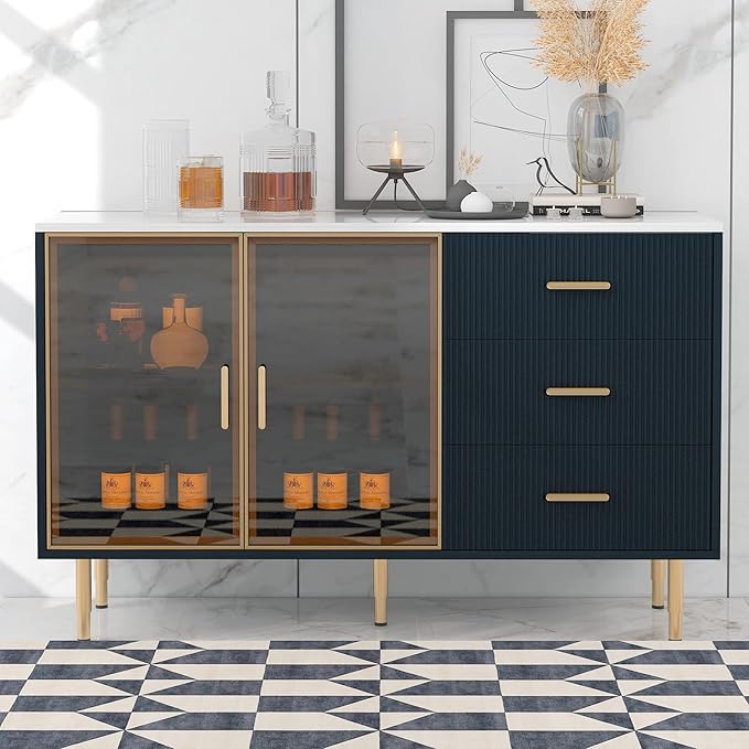 Modern Sideboard MDF with Marble Sticker Tabletop and Amber-Yellow Tempered Glass Doors,Freestanding Buffet Storage Cabinet,W/Gold Metal Legs & Handles,for Dining Room,Kitchen,Navy Blue, 60"