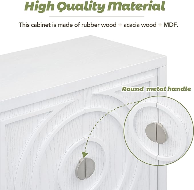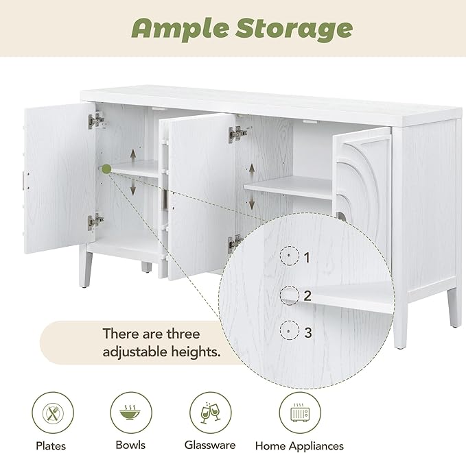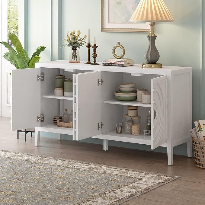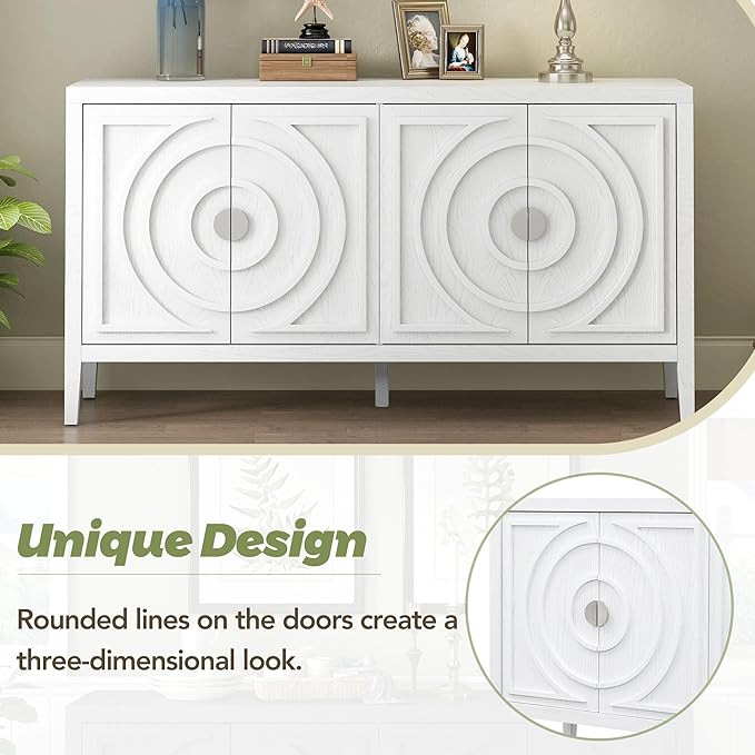 Retro Sideboard with Circular Groove Design Round Metal Door Handle,Wooden Buffet Cabinet,W/Adjustable Shelves & Open Countertop,for Entrance Living Dinning Room,White, 60"