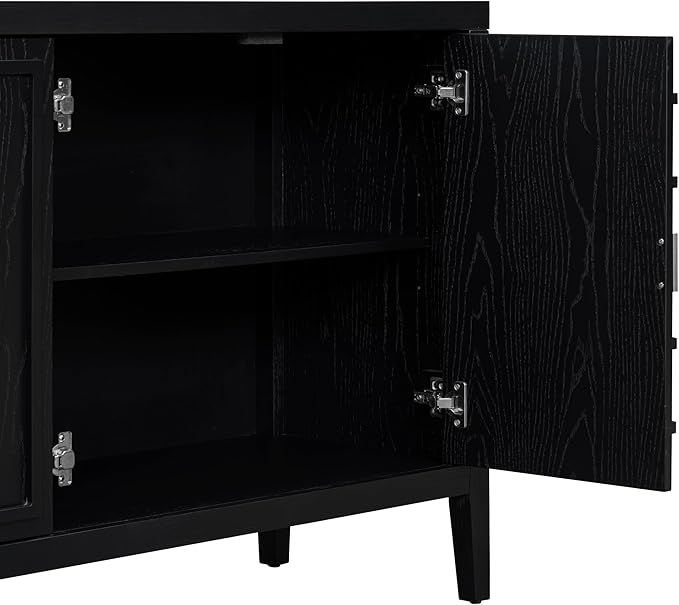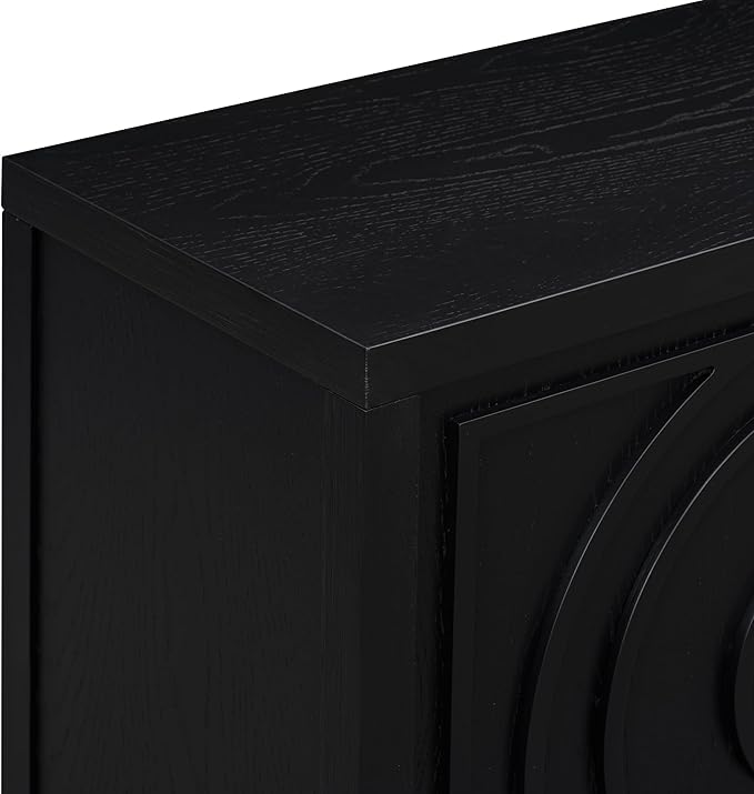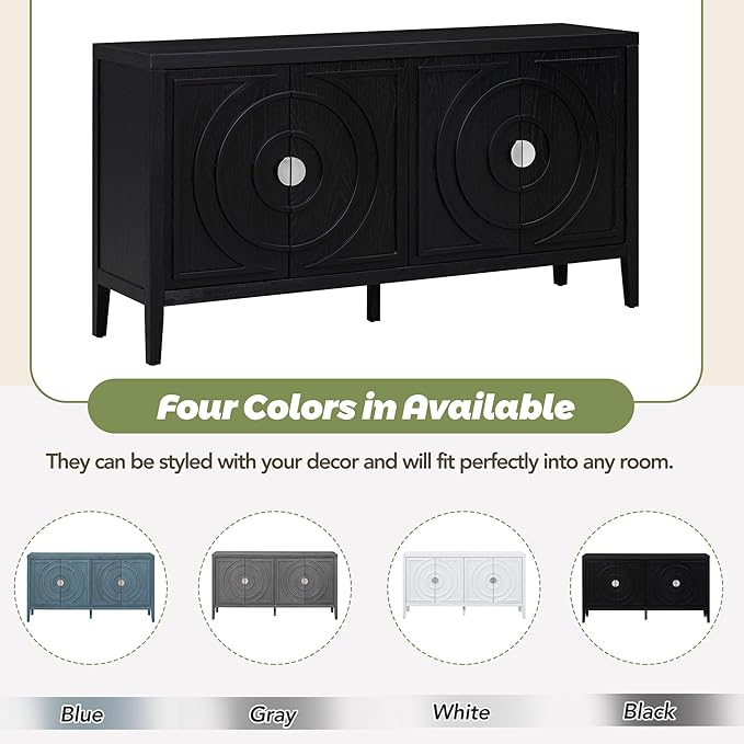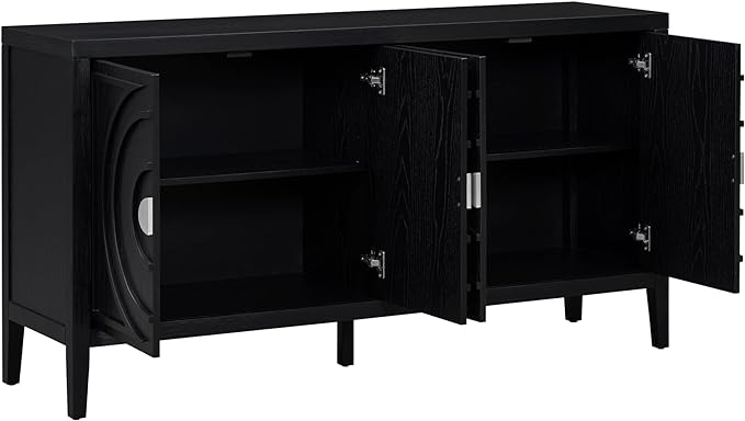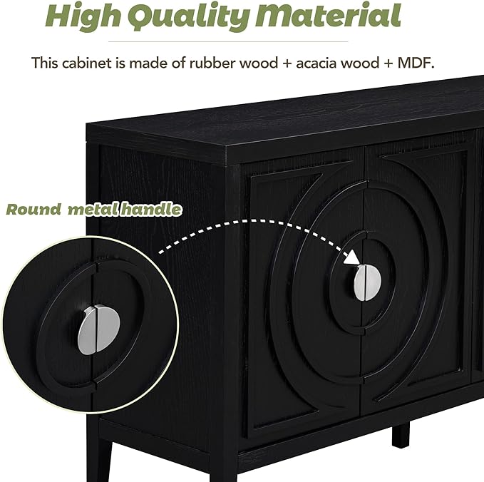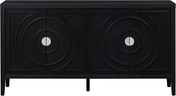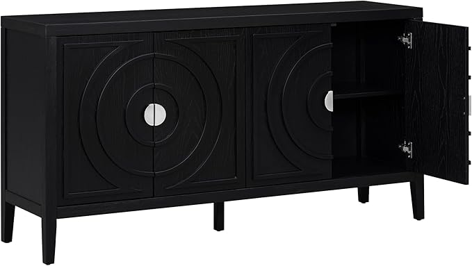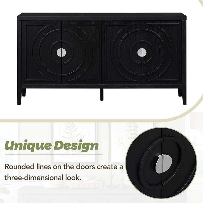 Retro Sideboard with Circular Groove Design Round Metal Door Handle,Wooden Buffet Cabinet,W/Adjustable Shelves & Open Countertop,for Entrance Living Dinning Room,Black, 60"