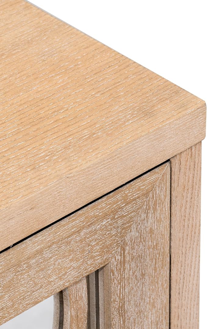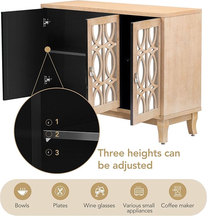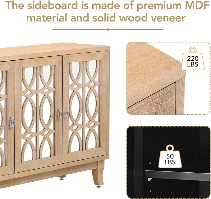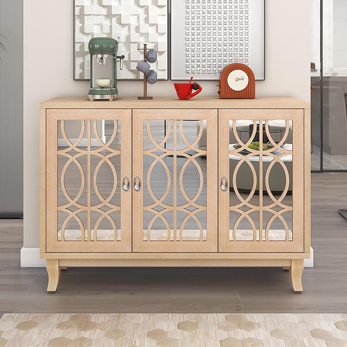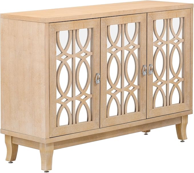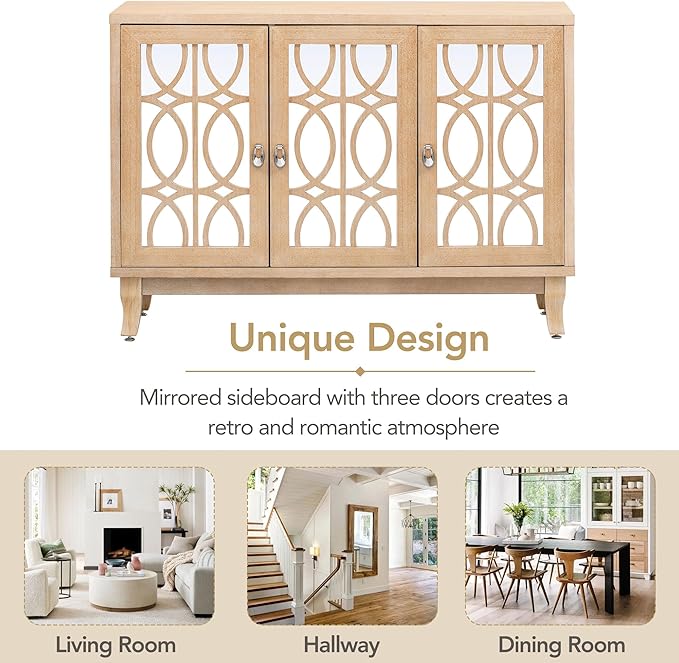 Multifunctional Sideboard with Glass, Vintage 3 Door Mirrored Buffet Cabinet,W/Silver Handle,Easy to Assemble,Console Table for Living Room Hallway Entryway,Natural Wood Wash, 47.2"