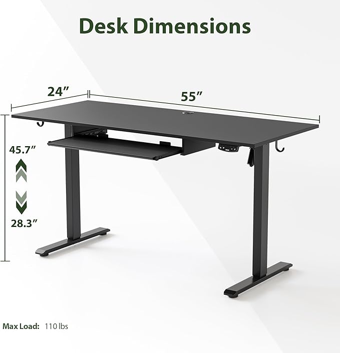 Height Adjustable Desk with Keyboard Tray, 55 x 24 Inches Electric Standing Desk, Stand up Computer Table with Memory Preset, Gaming Modern Lift Motorized Gaming Workstation, Black