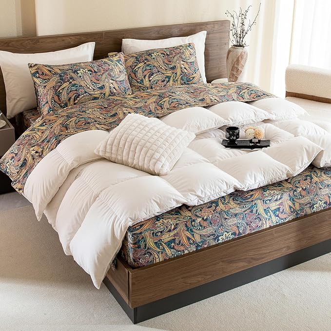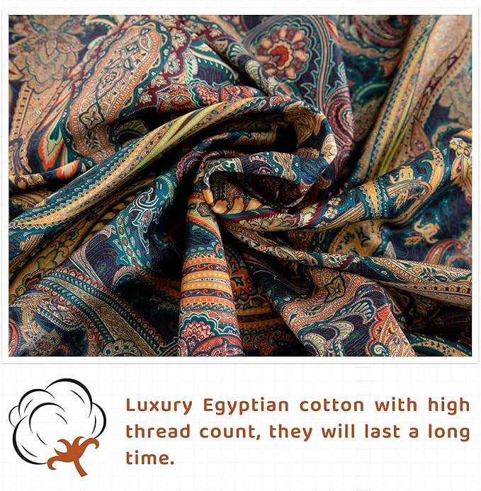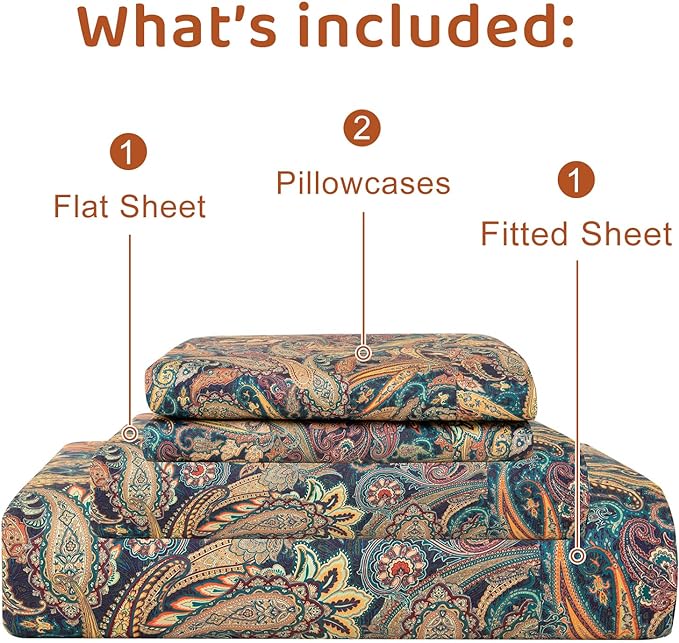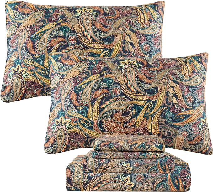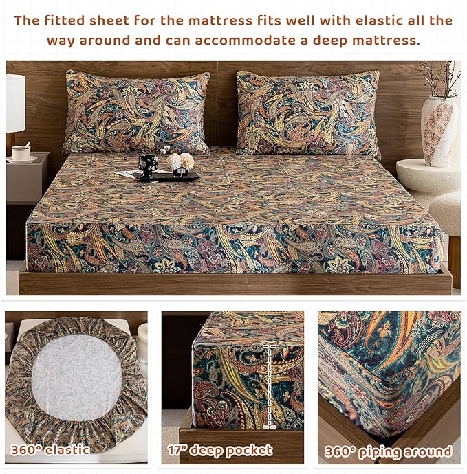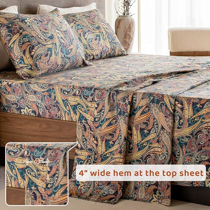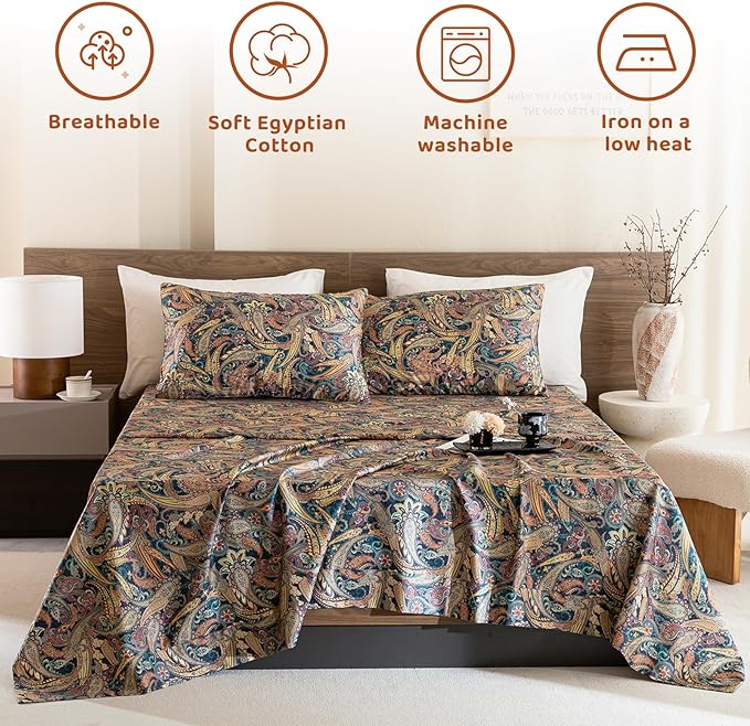 QSH Boho Bed Sheets Queen Size - 100% Egyptian Cotton Sheets Elegant Paisley Flower Pattern Printed Bedding Sheets Queen Size Bohemian Bedding 4pcs Deep Pockets Bed Sheets