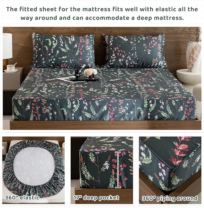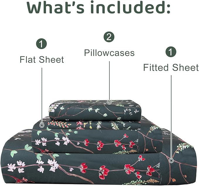 • 4PCSs Queen Size Bed Sheet Set - Include 1 pc floral flower pattern flat sheet - 90"x102", 1 pc floral fully elasticized fitted sheet(up to 17.5" deep)- 60"x80", 2 pillowcases - 20"x30".All pieces of our queen sheet set deep pocket are designed to fit neatly into one another.