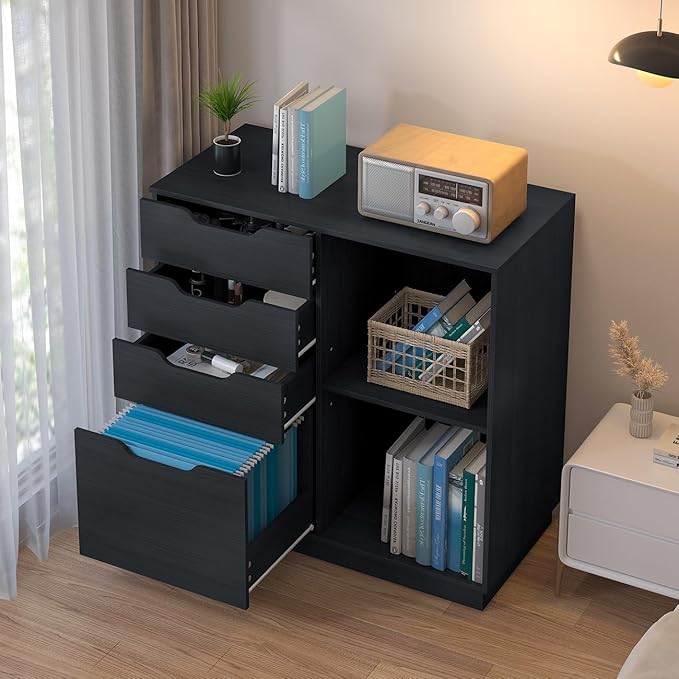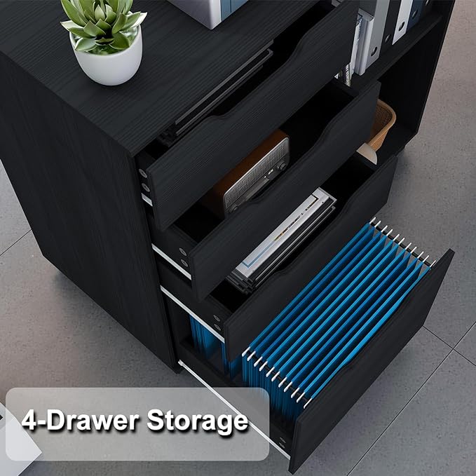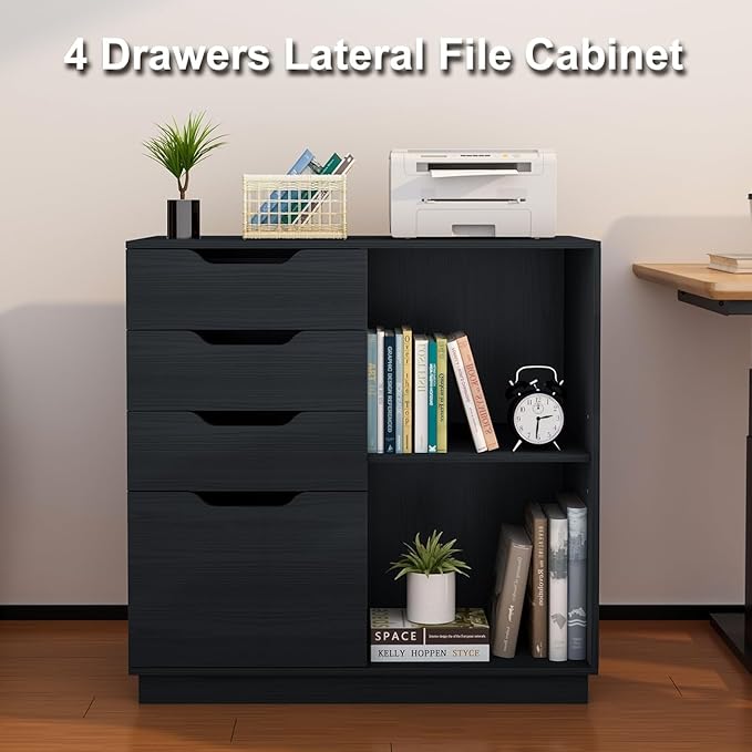 4 Drawers Lateral File Cabinet, Wood Filing Cabinet, Printer Stand with Open Storage Shelves for Home Office, 6 Compartments, Black