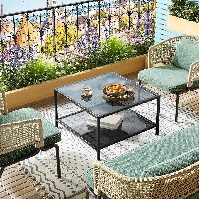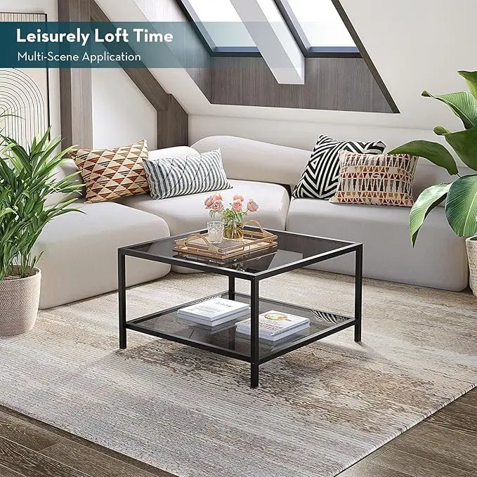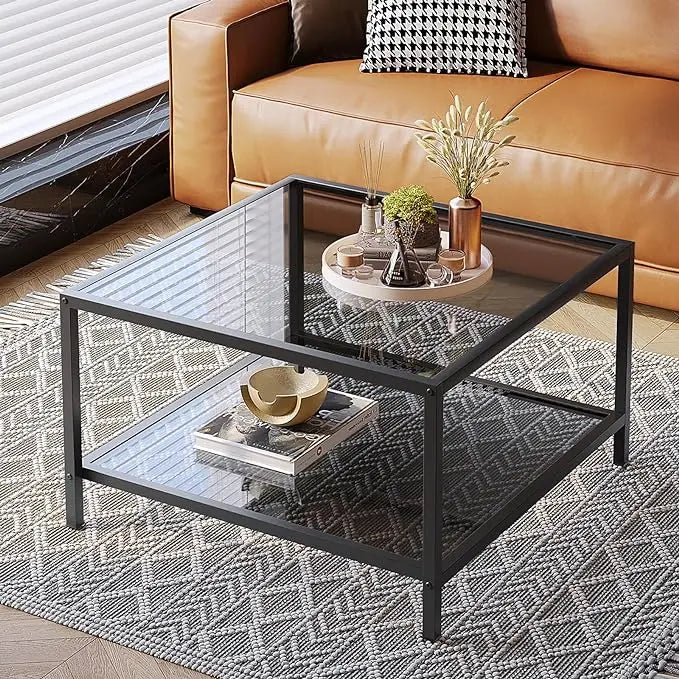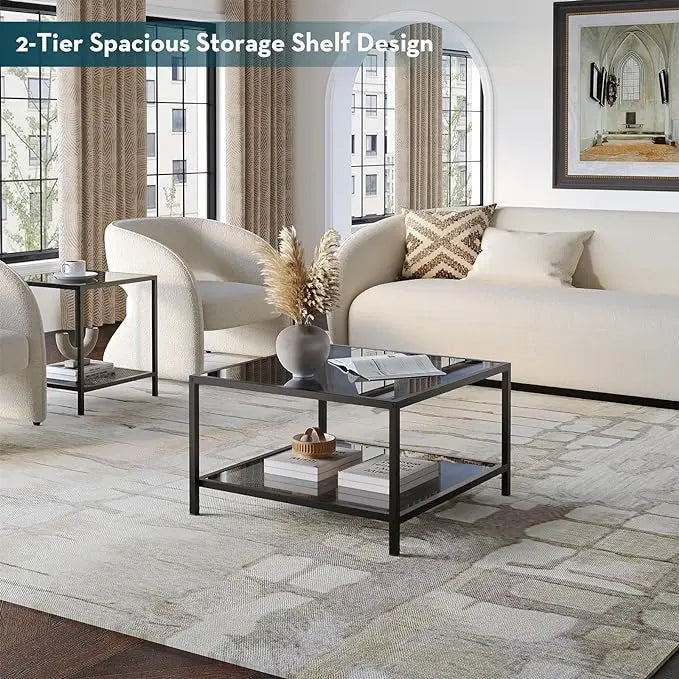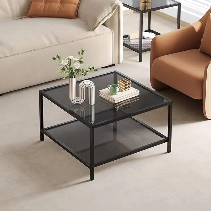 SAYGOER Modern Coffee Table Small Glass Coffee Table with Storage 2-Tier Simple Square Center Table for Living Room Home Office Sofa Table with Metal Frame 26.7 x 26.7 x 15.7 Inches, Gray Black