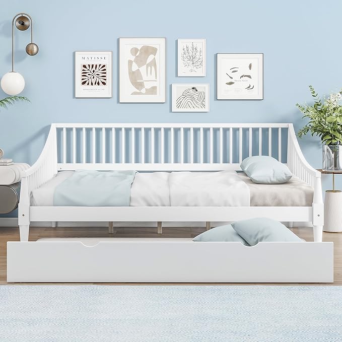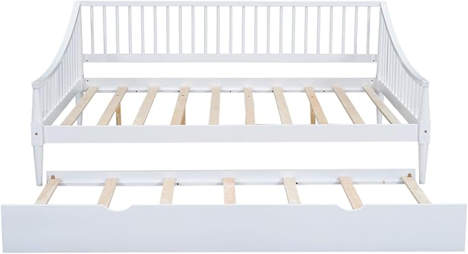 Full Size Daybed with Hideaway Trundle and Support Legs,Multi-Functional Wood Bed Frame,W/Rails Three Sides,Easy to Assemble,for Bedroom,Living Room,Apartment,White