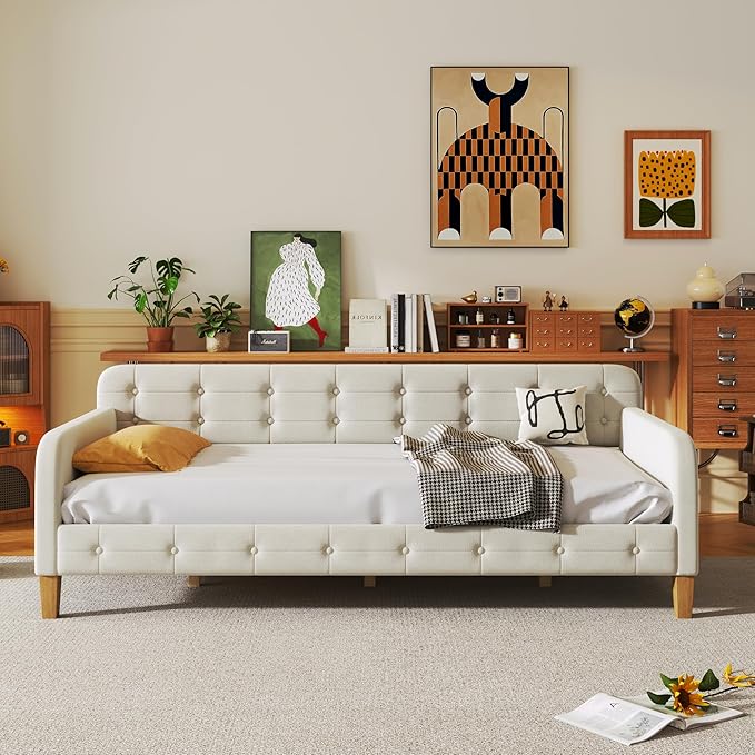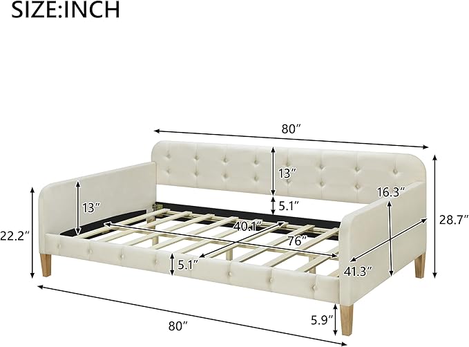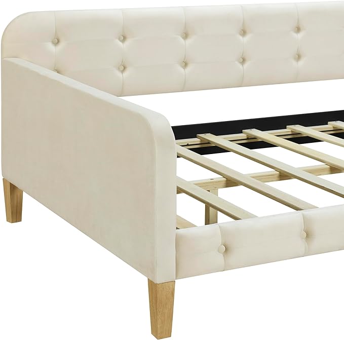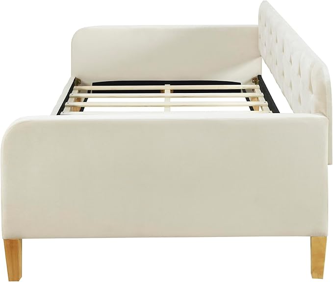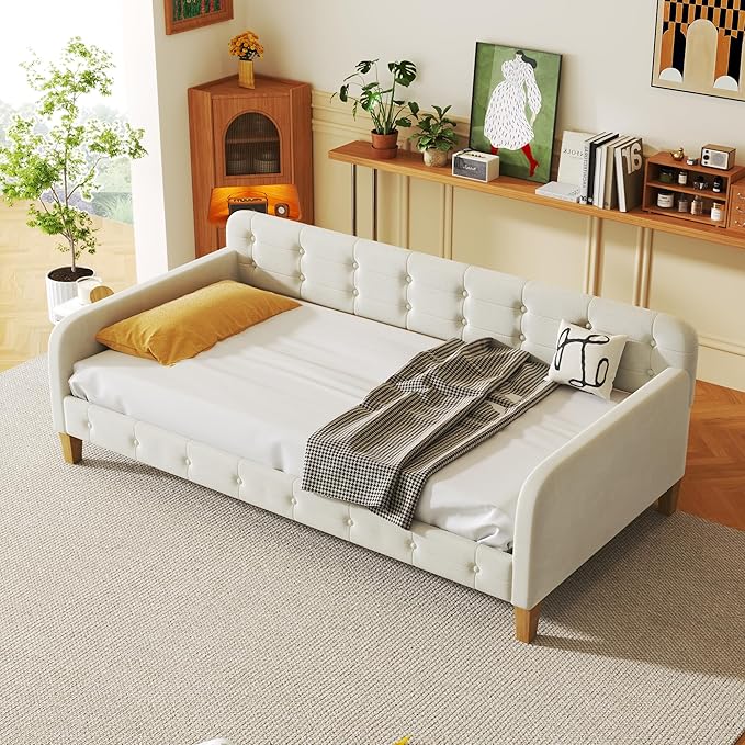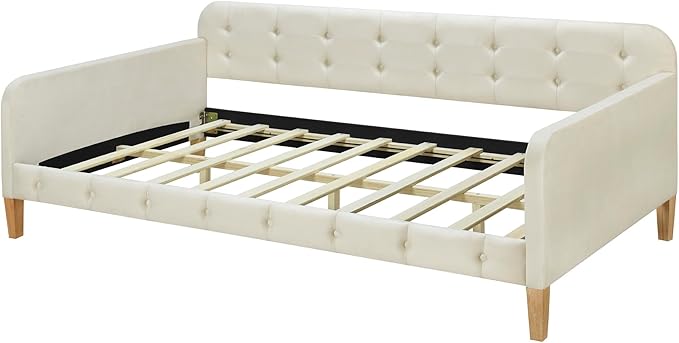 Twin Size Velvet Upholstered Dayed with 4 Support Legs,Multifunction Solid Wood Bed Frame,W/Backrest and Armrests,No Box Spring Needed,for Living Room Dormitory Apartment,White