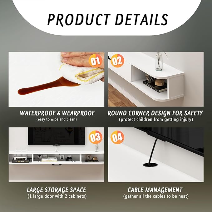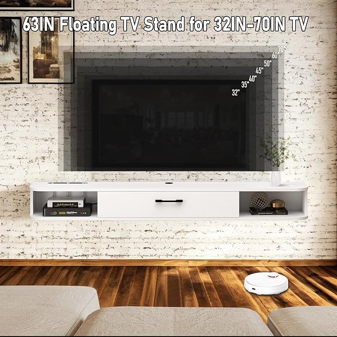 Floating TV Unit, 63'' Wall Mounted TV Cabinet, Floating Shelves with Door, Modern Entertainment Media Console Center Large Storage TV Bench for Living Room & Office (62.99IN, White)