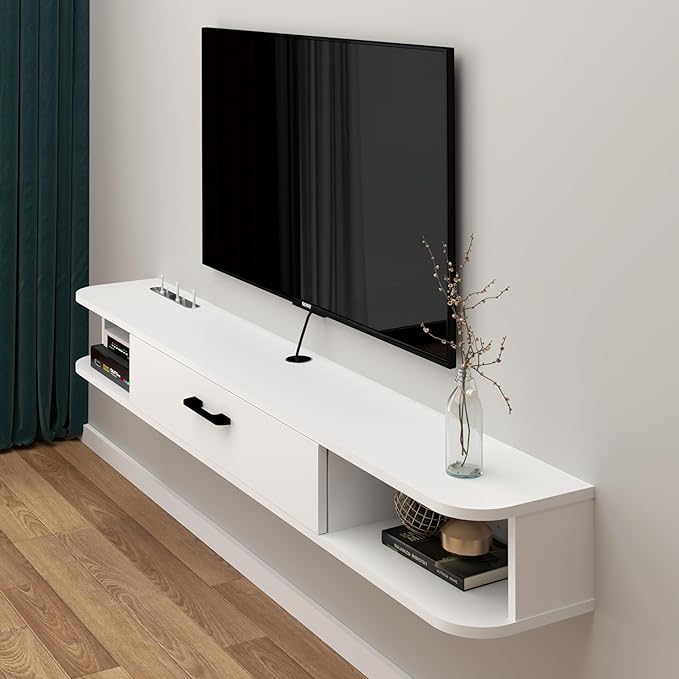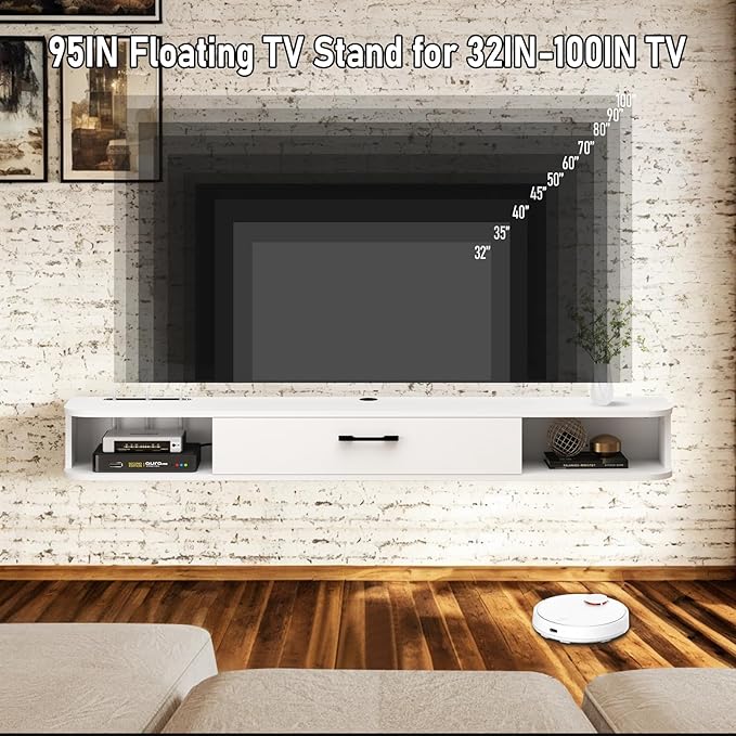 Floating TV Unit, 95'' Wall Mounted TV Cabinet, Floating Shelves with Door, Modern Entertainment Media Console Center Large Storage TV Bench for Living Room & Office (94.49IN, White)