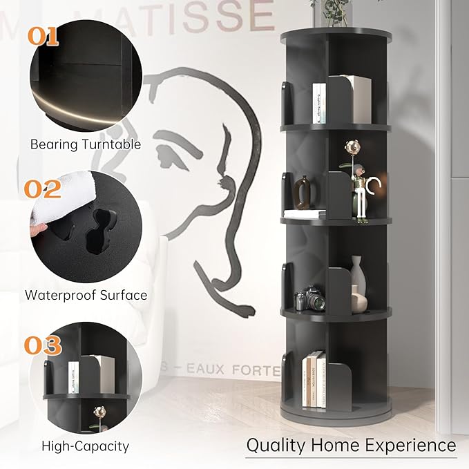 DMAITH Rotating Bookshelf, 360° Display Corner Bookcase for Small Space, 4 Tier Floor Standing Bookshelf Storage Rack, Wood Bookshelf Organizer for Kids' Room, Study Room, Bedroom, Black