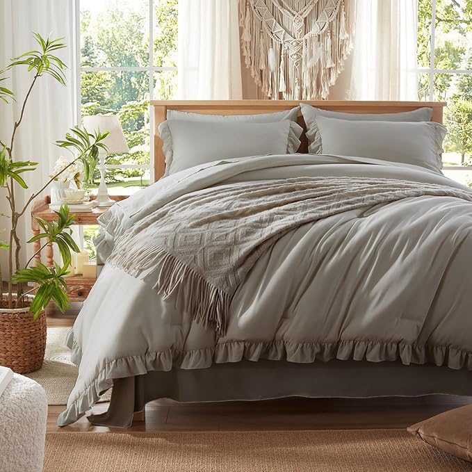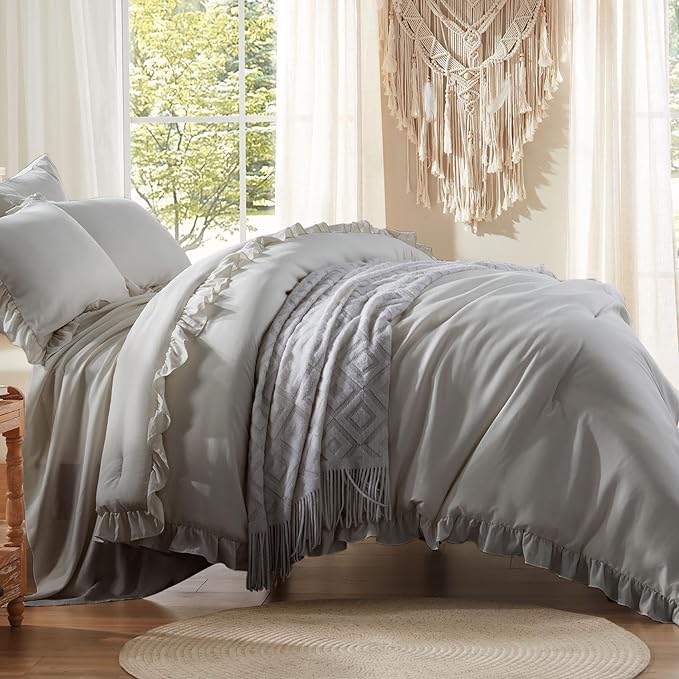 Anluoer Full Comforter Set 7 Piece, Grey Bed in a Bag with Sheets, All Season Ruffle Shabby Chic Bedding Sets with 1 Comforter, 2 Pillow Shams, 2 Pillowcases, 1 Flat Sheet, 1 Fitted Sheet