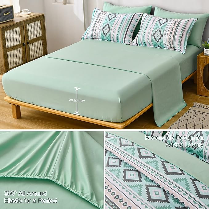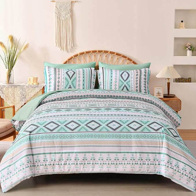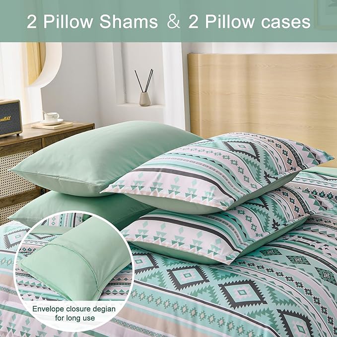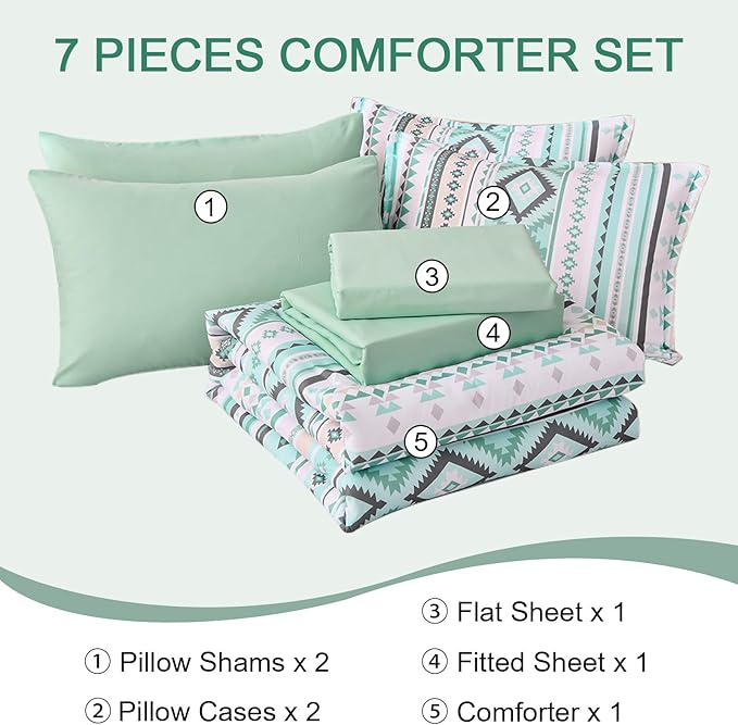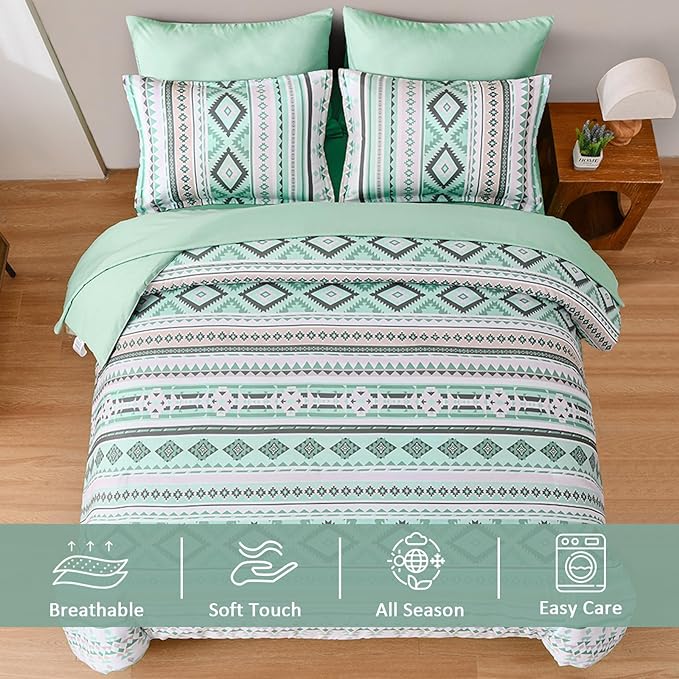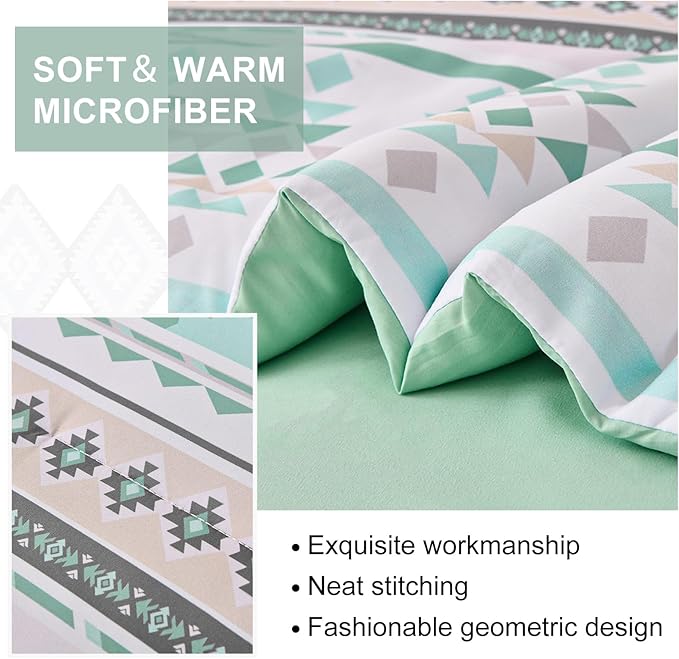 About This 【High-Quality Boho Comforter Bed Set】:Aztec green striped bedding set is filled with a fluffy polyester fill that is...