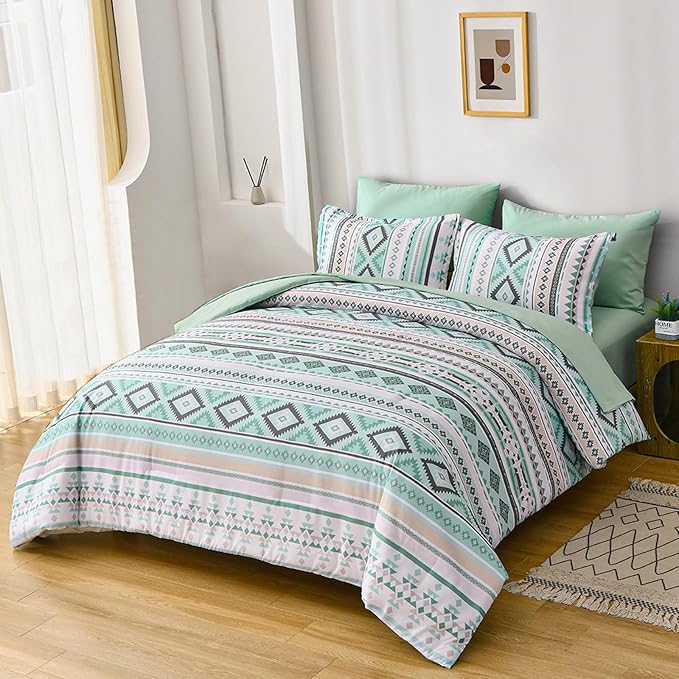 Dinjoy Sage Green Boho Comforter Set Queen Size,7 Pieces Bed in a Bag Queen Light Green Aztec Bedding Sets with Sheets Bohemian Geometric Striped Complete Set for All Seasons 90"x90"