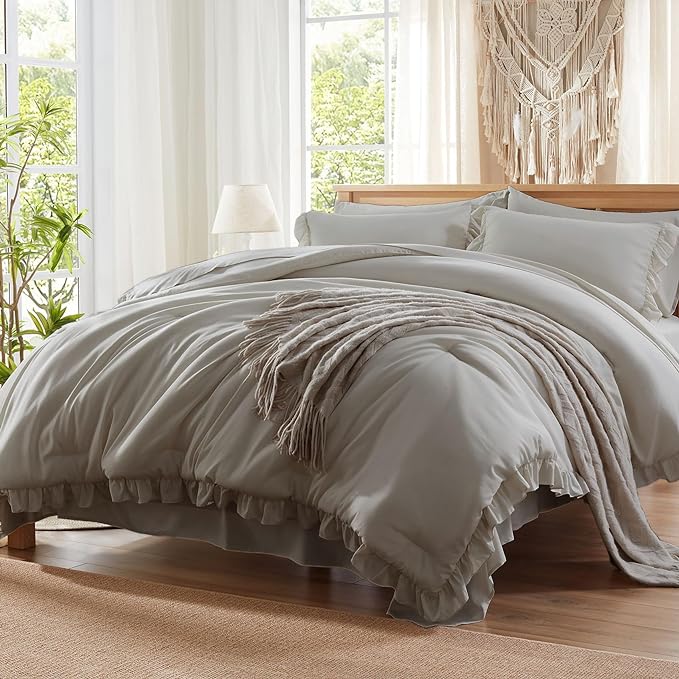 Anluoer King Comforter Set 7 Piece, Grey Bed in a Bag with Sheets, All Season Ruffle Shabby Chic Bedding Sets with 1 Comforter, 2 Pillow Shams, 2 Pillowcases, 1 Flat Sheet, 1 Fitted Sheet