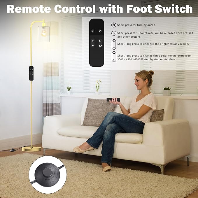PAZZO LED Floor Lamp, Industrial Standing Lamp with Glass Lampshade, Ideal for Living Room, Bedroom, and Office,Gold(includes Remote Control)