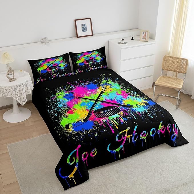 Feelyou Kids Ice Hockey Comforter Set Twin Size Gaming Sports Bedding Set for Boys Girls Teens Bedroom Decor Ice Sports Games Tie Dye Comforter Hockey Player Duvet Set with 1 Pillow Case